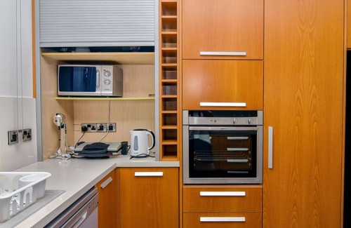 The dining area has a large modern table with 8 chairs. There are doors which lead out onto a long terrace which has panoramic sea views. The kitchen is modern and has a halogen hob, electric oven, fridge/freezer, dishwasher, toasted sandwich maker and a Frappe coffee machine. There is also a small breakfast bar with 3 stools.
