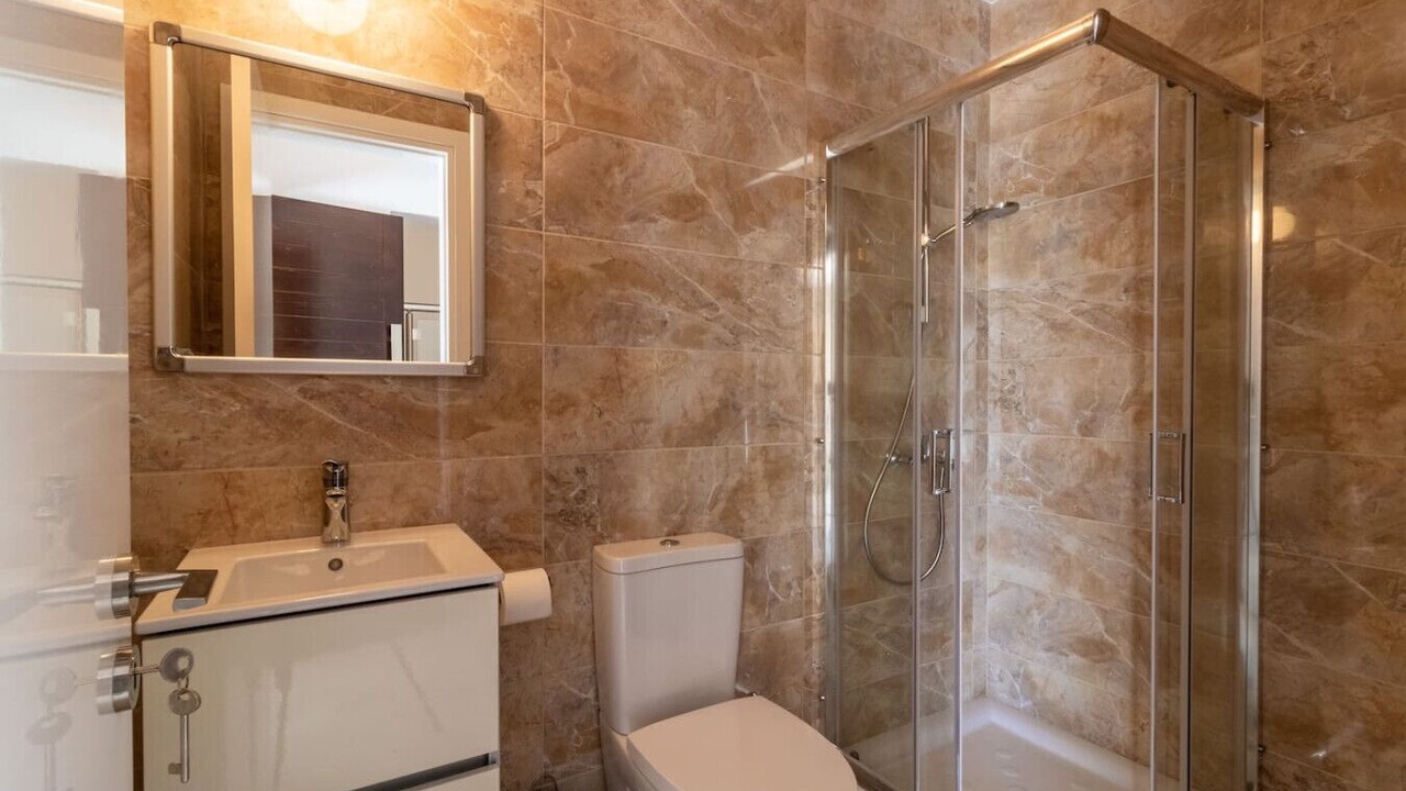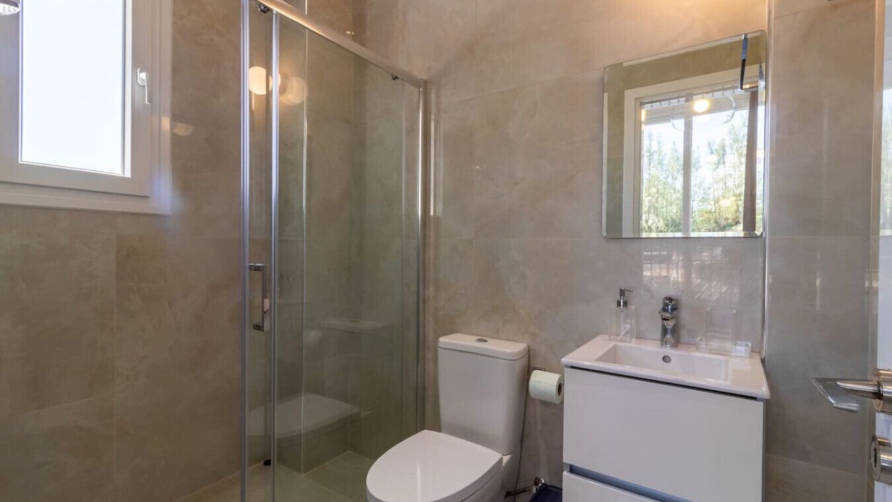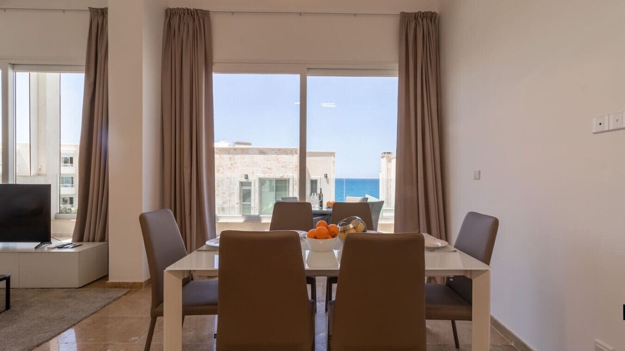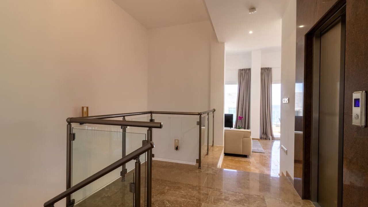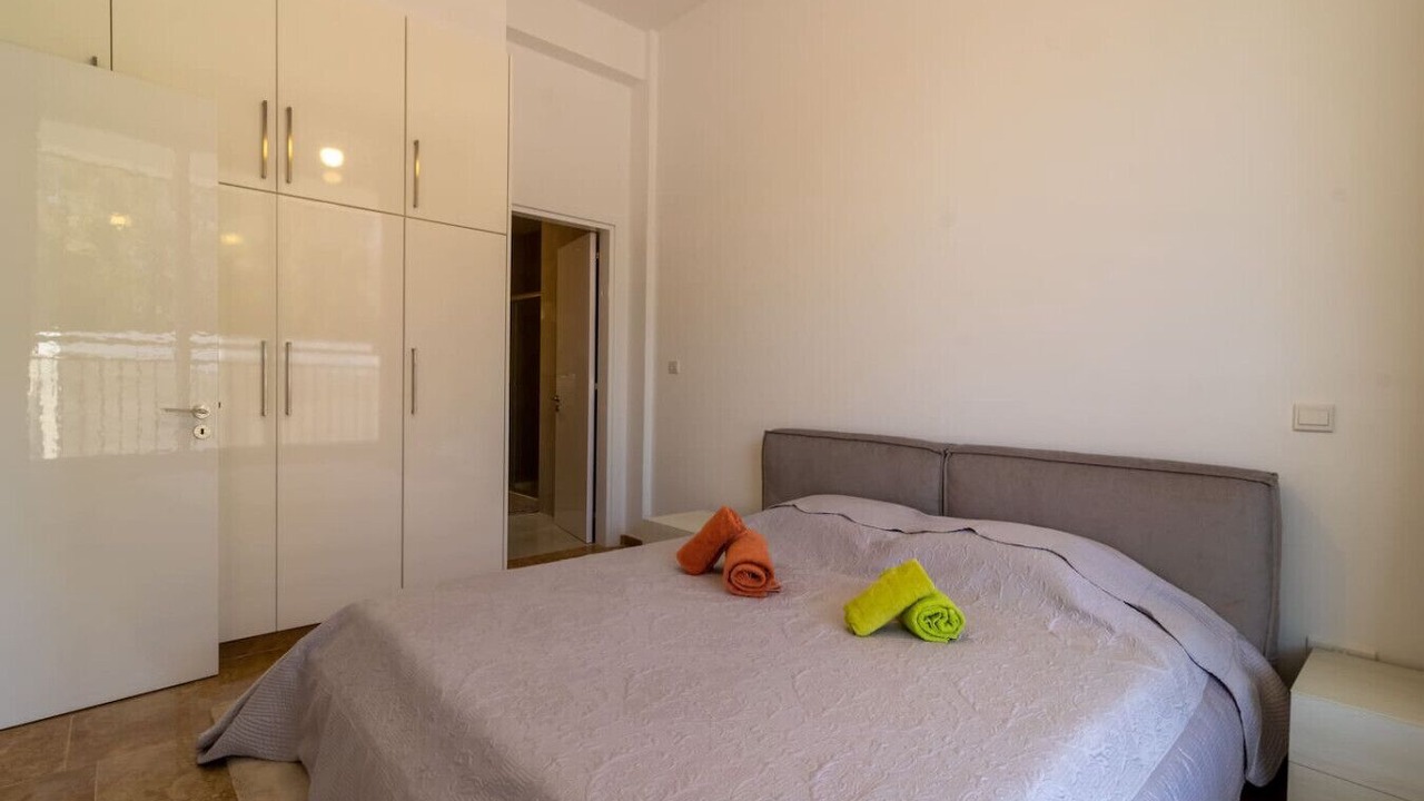 The sea and the beach are a 2-minute walk, and a spacious balcony-patio overlooking the sea, and two cozy bedrooms, each with its own bathroom, guest toilet, kitchen, elevator, and stairs between floors.