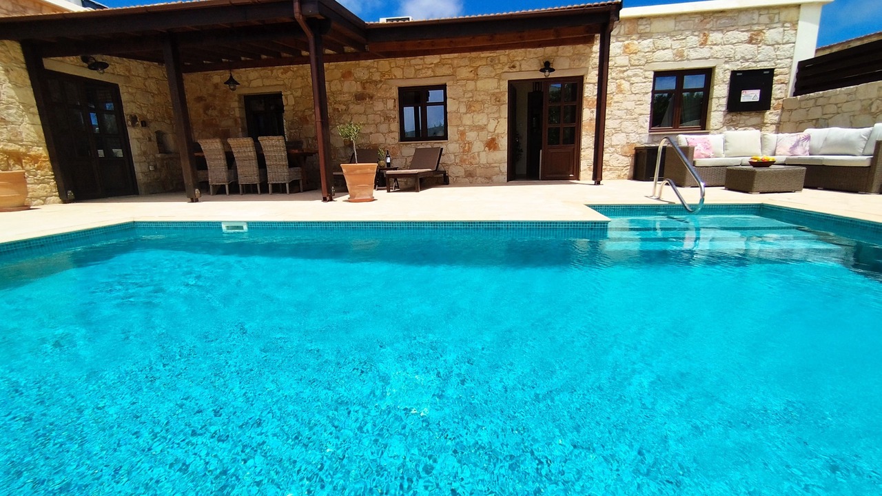Anastasia's House in Kathikas, Paphos District, Cyprus is privately positioned within a courtyard setting. Anastasia's House is a three bedroom stone built villa that sleeps six. Renovated to a very high standard in 2022, it has stunning stone features inside the villa that feel like a traditional Cypriot village home. The villa features every modern convenience. It includes private pool, garden, air conditioning, washing machine, dryer, dishwasher, Nespresso Machine, Wi-Fi and is a very short and flat walk to shops, bars and restaurants.. **Wi-Fi and Premium IPTV**