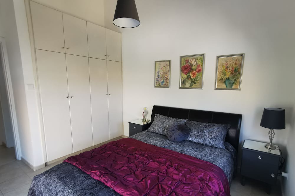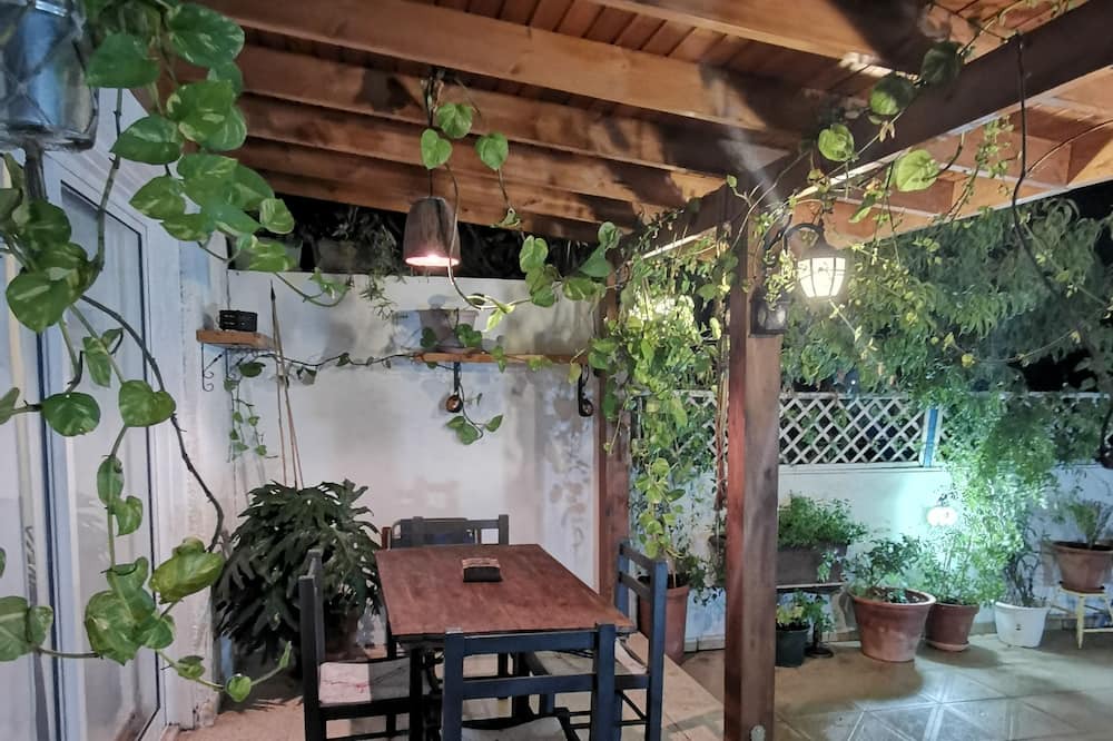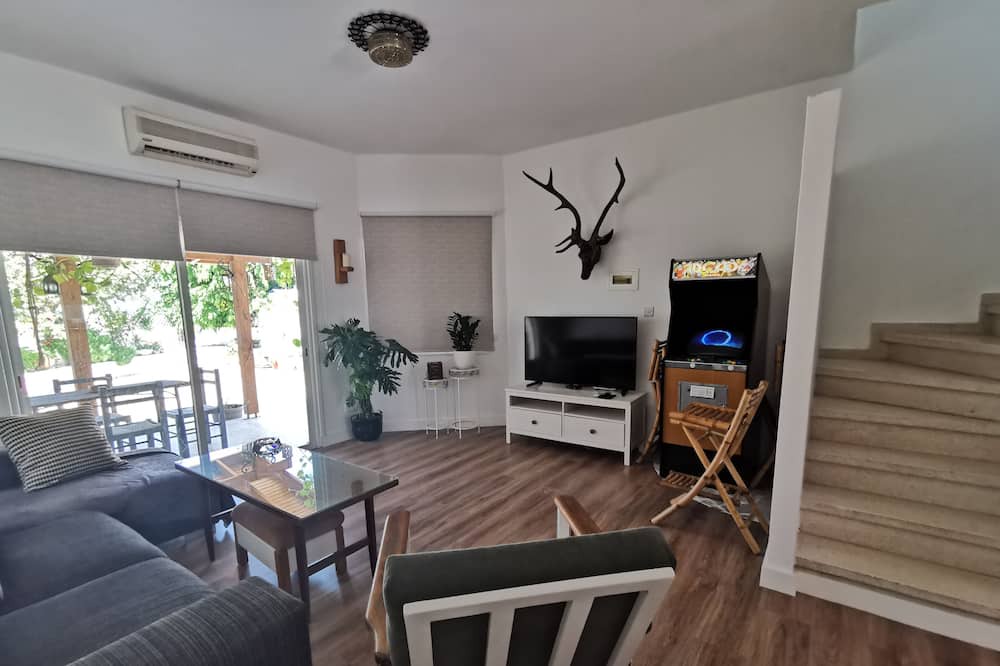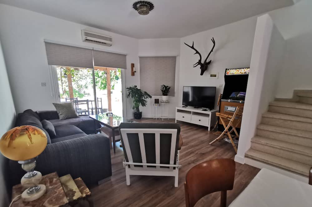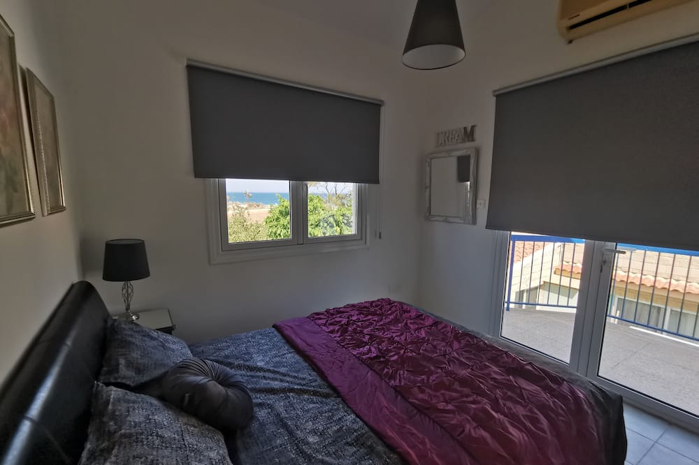 Soak up this modern and vintage style, newly renovated and remodelled beach house to suit your summer or winter holidays. Enjoy the original art work and retro style pieces complementing the interior. Sitting in the yard and the patio you can smell the strong and distinct aromas from the botanical plants enjoying the sound of the waves while relaxing in the serene and silent atmosphere. Just 1 minute walk to one of the best beaches in Larnaca with a small beach bar and sunbeds. It consists of two bedroom, one with king-size bed and another with 2 single beds. Both bedrooms with balconies. Downstairs you will find a fully equipped kitchen with all the modern amenities and a large living room with large corner sofa which sleeps another person if needed.