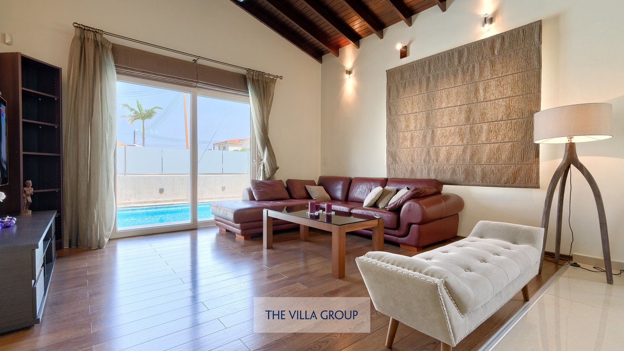 The spacious open plan living area features two lounge areas with sofas, a fireplace and internet TV, a formal dining area and fully equipped modern kitchen, all furnished to a high standard. The full-width folding patio doors from the living area allows access to the covered furnished terrace and private swimming pool.