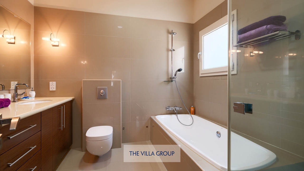 Three of the villa’s bedrooms are located on the ground floor. A large master bedroom with a beautiful wooden beamed ceiling, en-suite bathroom with walk-in shower and patio doors leading to the terrace and private swimming pool; a further double bedroom and twin bedroom. A separate shower room is available on this floor.