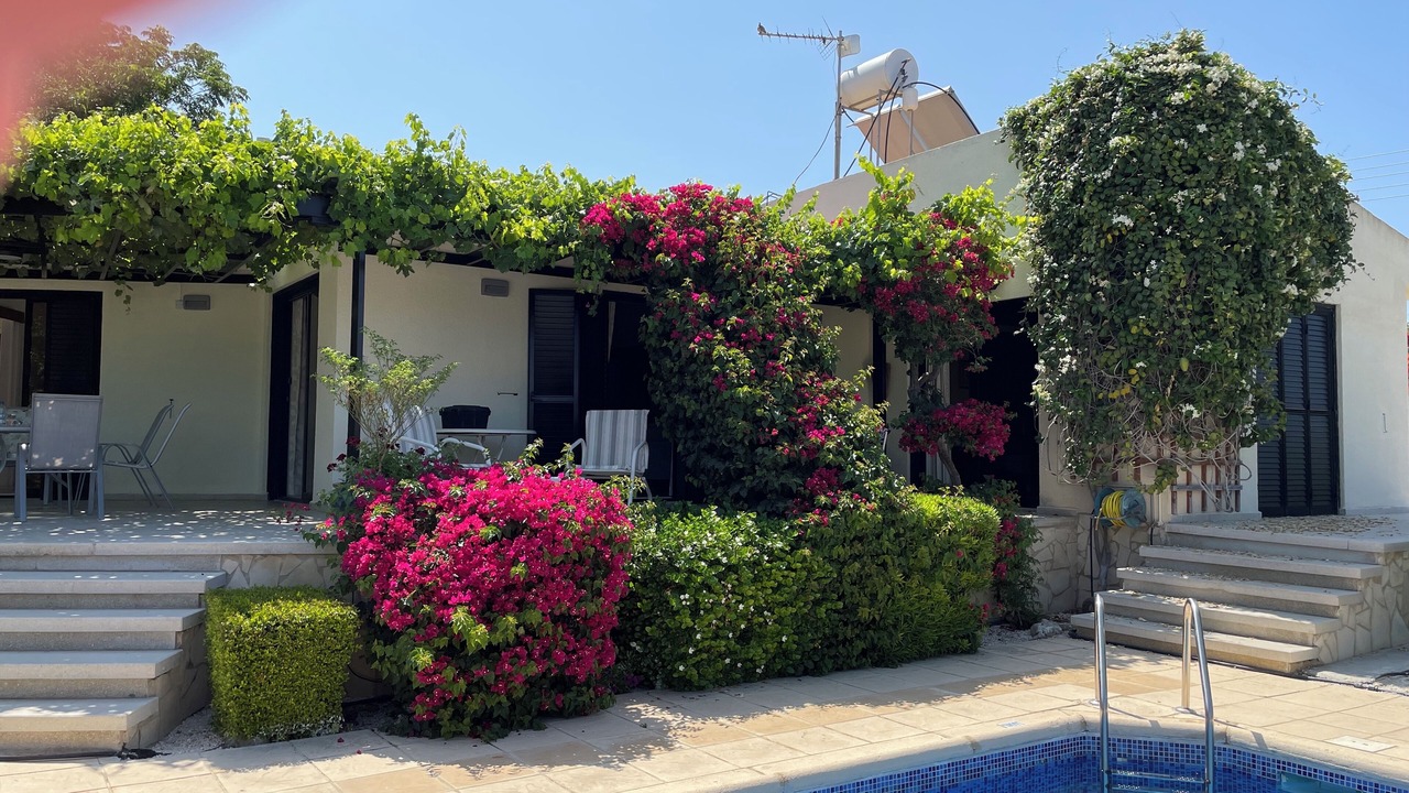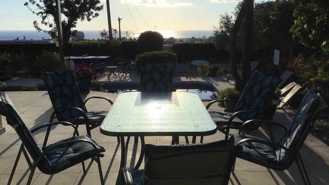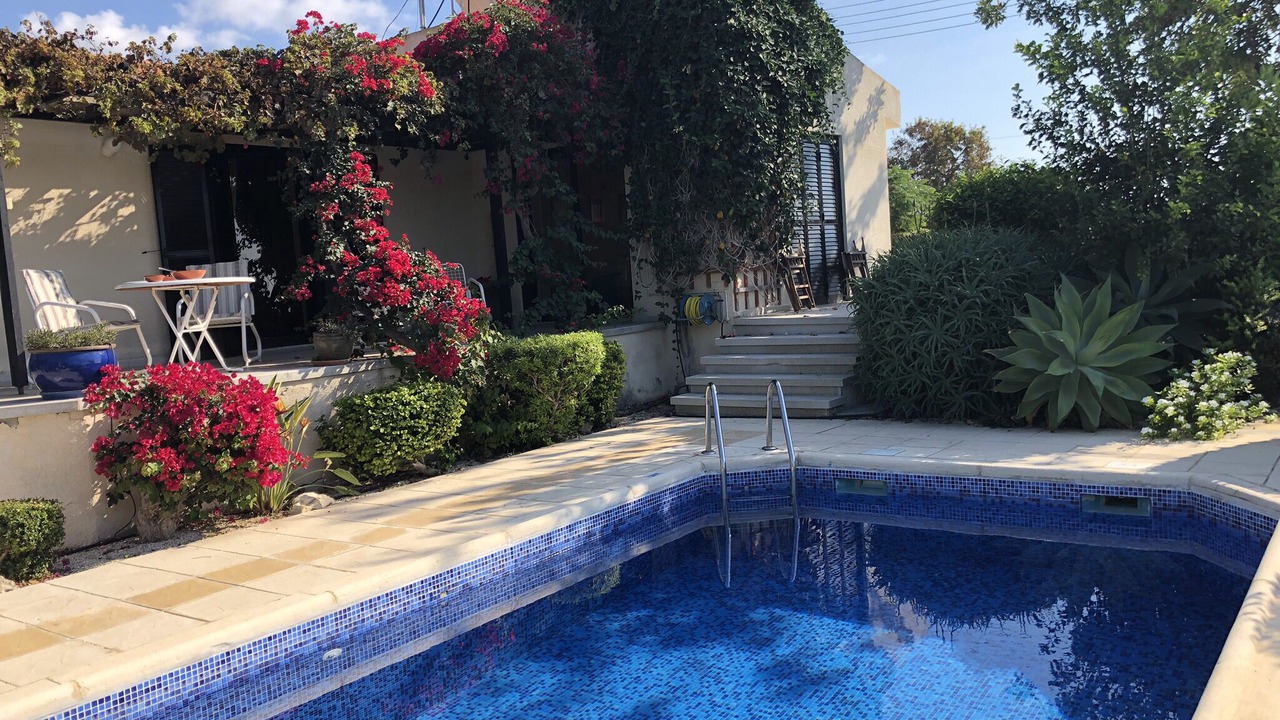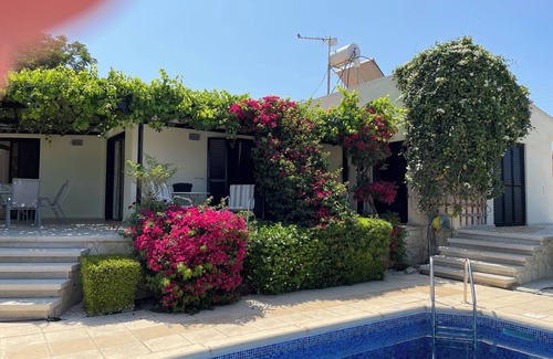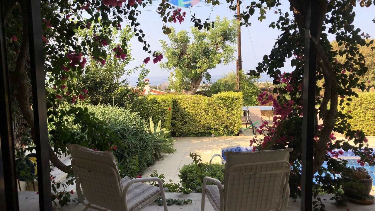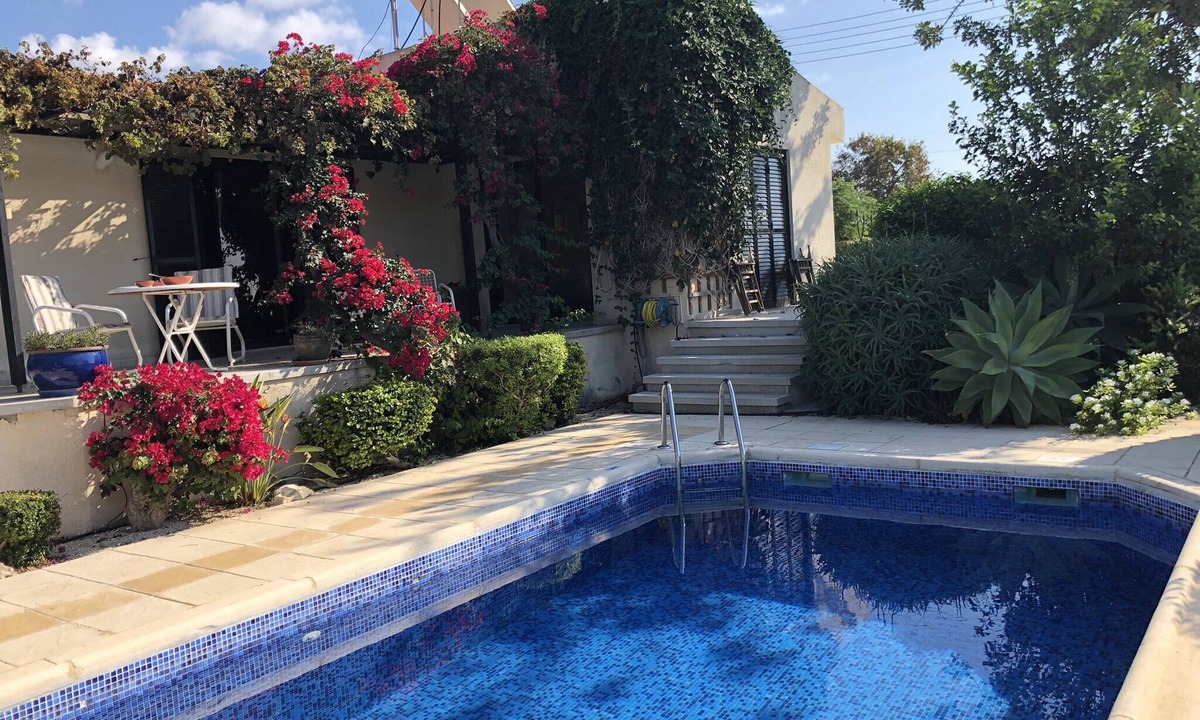 Our family villa has a large mature garden with shaded patios and seating areas, as well as a lovely pool protected from view by a well established flowering hibiscus hedge. The villa is situated half way up a gentle rise from the sea to Chlorakas village, so a gentle breeze shields you from the heat of the day. It was built when only a small area of the plot could be used and so gives a wonderful sense of space and peace.