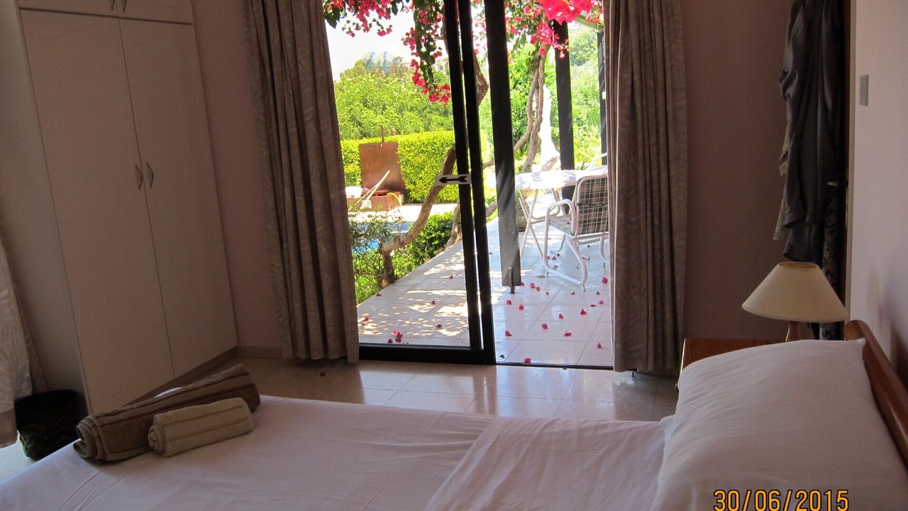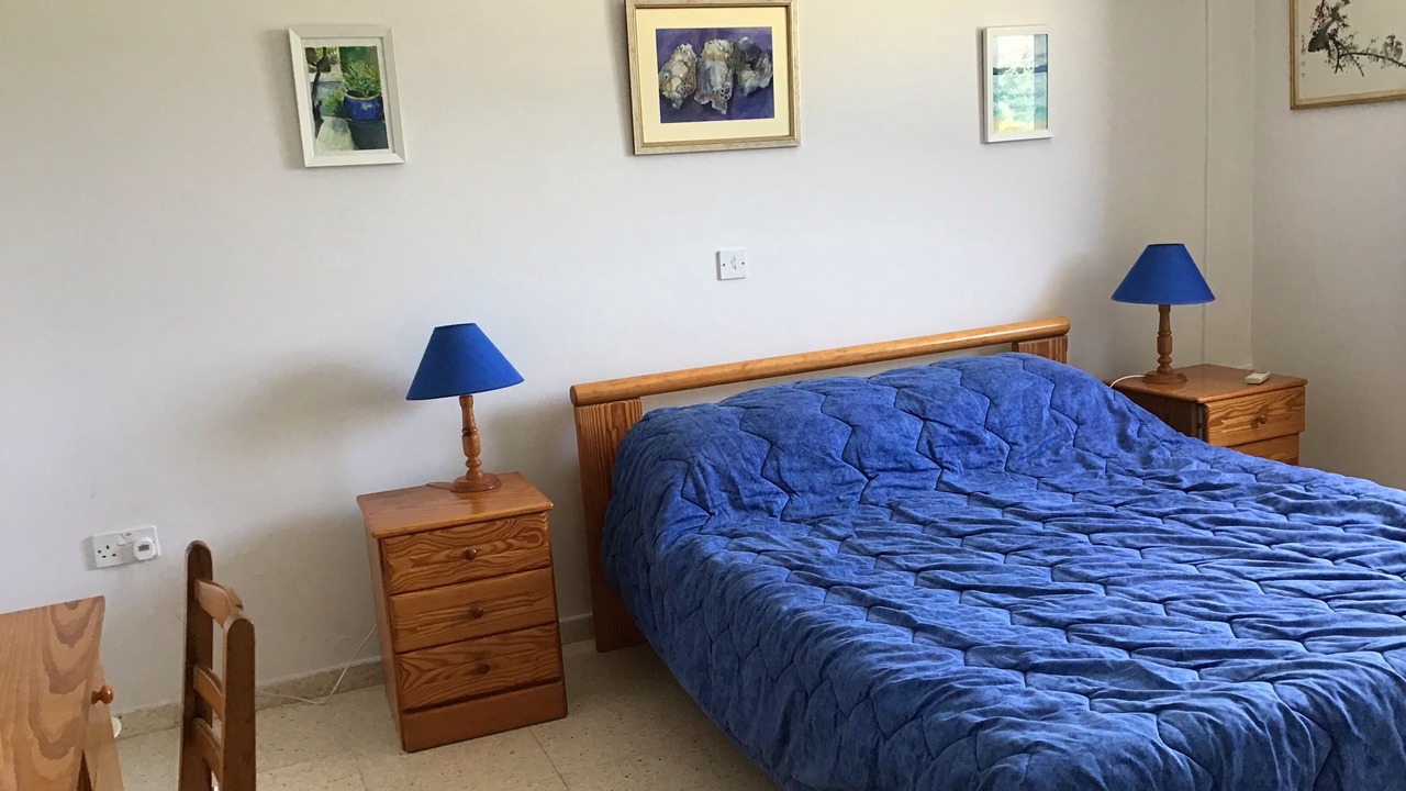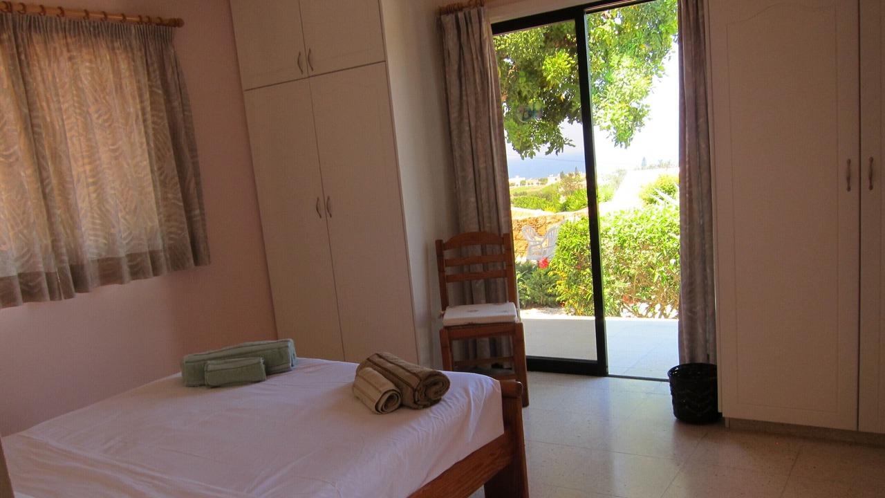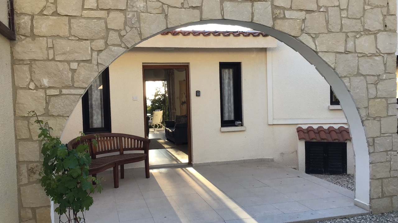 Our family villa has a large mature garden with shaded patios and seating areas, as well as a lovely pool protected from view by a well established flowering hibiscus hedge. The villa is situated half way up a gentle rise from the sea to Chlorakas village, so a gentle breeze shields you from the heat of the day. It was built when only a small area of the plot could be used and so gives a wonderful sense of space and peace.