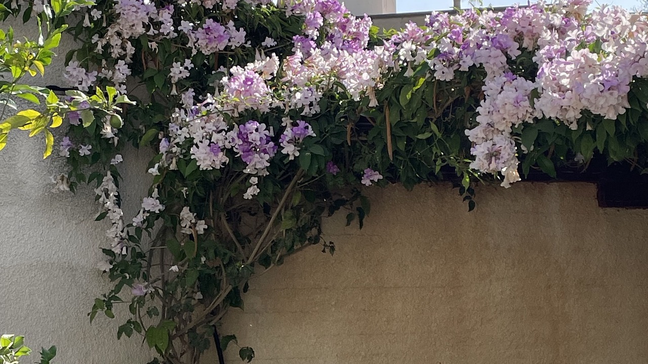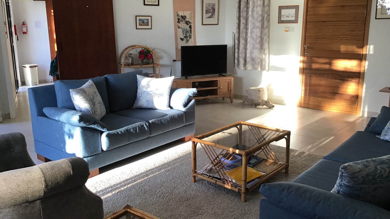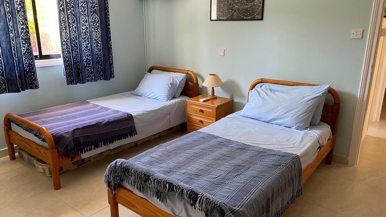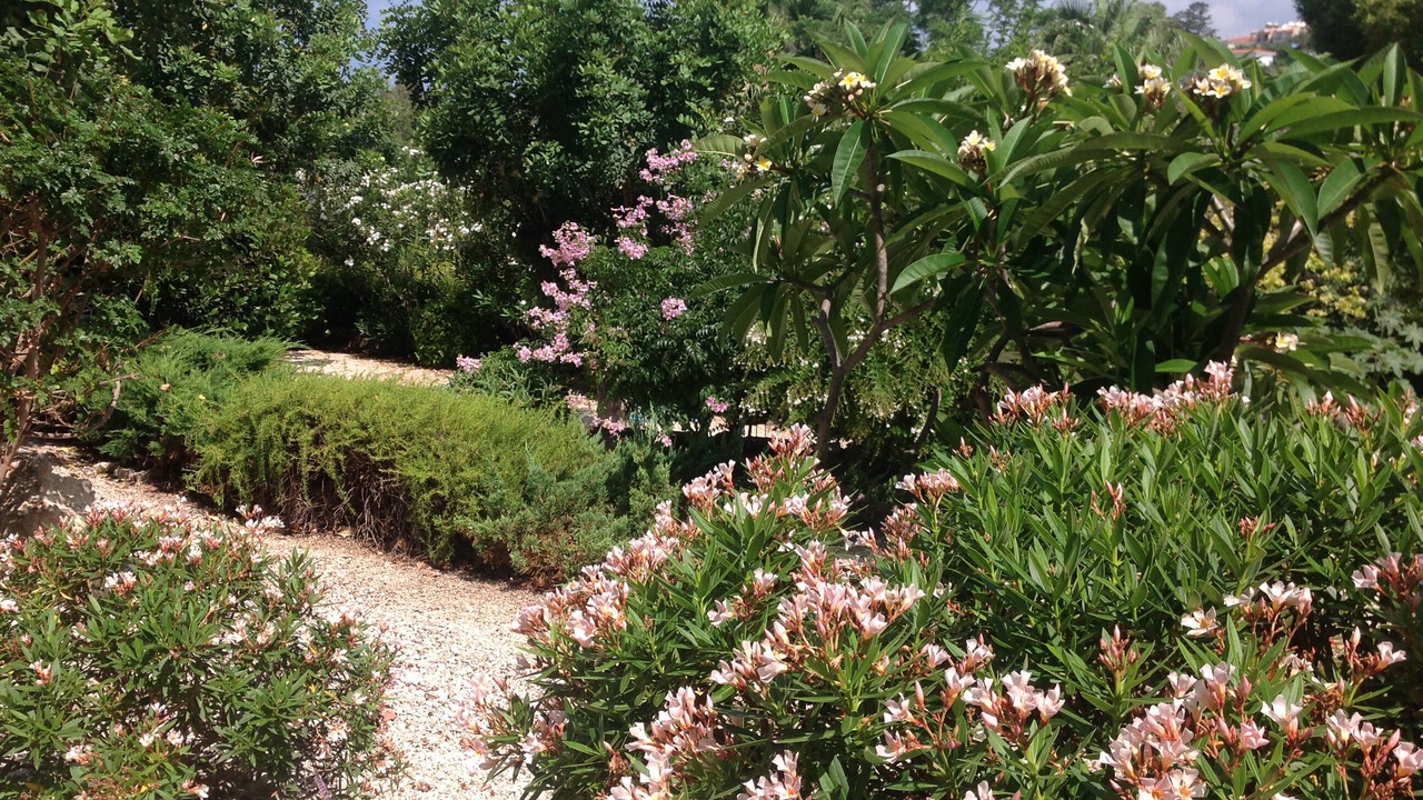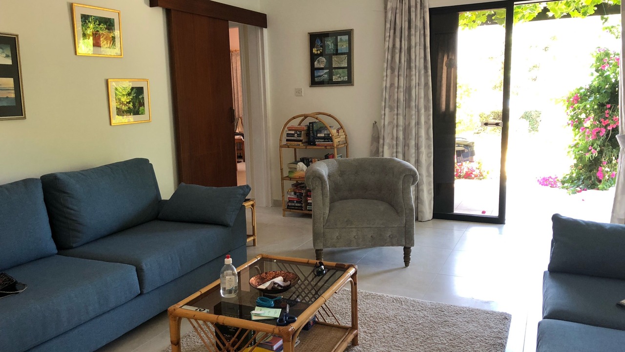 Our family villa has a large mature garden with shaded patios and seating areas, as well as a lovely pool protected from view by a well established flowering hibiscus hedge. The villa is situated half way up a gentle rise from the sea to Chlorakas village, so a gentle breeze shields you from the heat of the day. It was built when only a small area of the plot could be used and so gives a wonderful sense of space and peace.