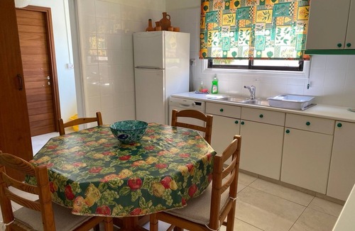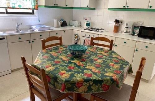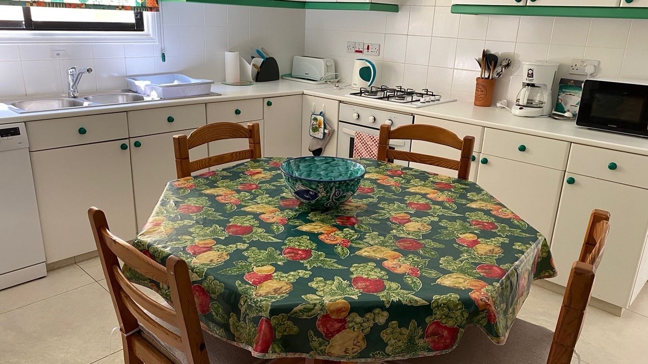 The kitchen is well equipped and now also has a dishwasher included. There is a round wooden table with 4 chairs should you want to eat inside at any time during your stay. The adjoining utility room with separate sliding door, houses a washing machine, an ironing board and iron, the barbecue equipment and also a large cupboard full of adult and child beach and pool toys for your enjoyment. There is a table tennis table outside with its own paved area and the barbecue is built in under a raised flowerbed which boasts 4 orange trees.