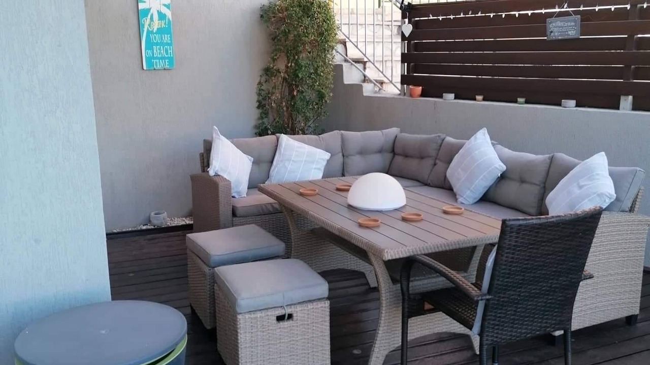 Outside the comfortable seating area is ideal for a relaxing drink while watching the sunset or the decked eating area with the new sunsail creates a lovely outside area with under floor lighting for an evening Cypriot BBQ