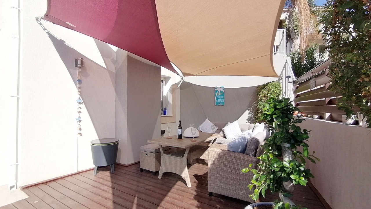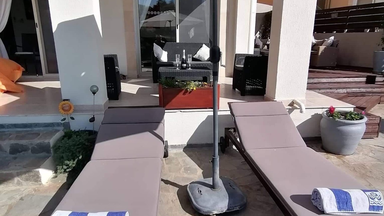 Sit outside at night under the new sunsail with outside deck lights for a lovely evening drink. The new sunsail creates a really shaded area to eat and relax through the day, out of the sun and for you to enjoy the views to the sea and the paphos coast,