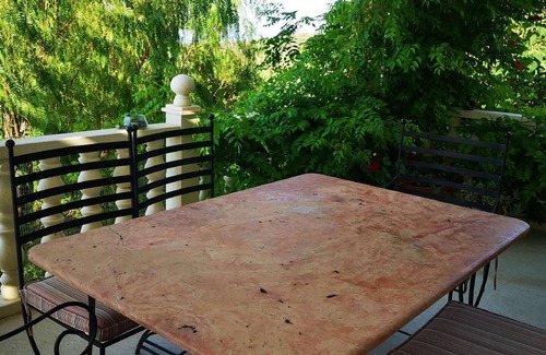 In the garden is a traditional woodburning oven which can be used to make pizza, bread, roast meats. There is also a brick built bbq and a smaller Cypriot style bbq. The gardens are extensive stretching down the hillside and contain seating areas under the trees and another rustic dining area with bench seating. There are fruit trees in the orchard and a grapevine which guests can pick fruit and nuts from. We have olives, figs, almonds, oranges, lemons, grapefruit, pomegranate and loquats, and red pepper trees. Below the house is a covered carport for 2 cars and above is a drive which gives flat access to the house.