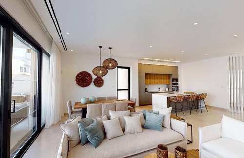 Inside, the villa is a testament to luxury and convenience, featuring high-end design across its multi-level layout. The interior includes a ground-floor living room complete with a guest bathroom, and four beautifully appointed en-suite bedrooms on the upper floors. Each bedroom serves as a sanctuary of comfort, outfitted with premium furnishings and smart TVs for your entertainment. The villa's advanced smart home automation system enhances your experience by controlling lighting, climate, and security effortlessly. Additionally, a private elevator ensures easy accessibility across the villa's three levels, emphasizing the property's commitment to comfort and accessibility.