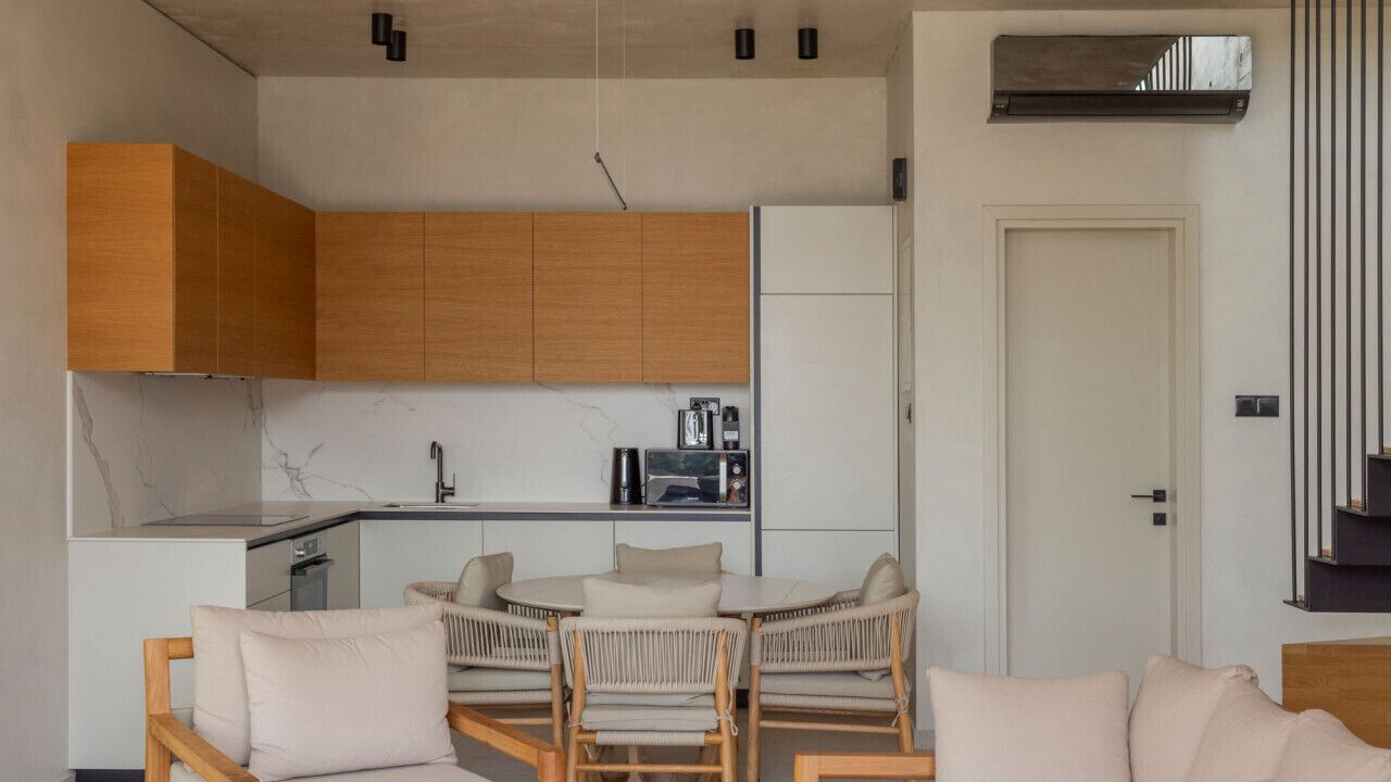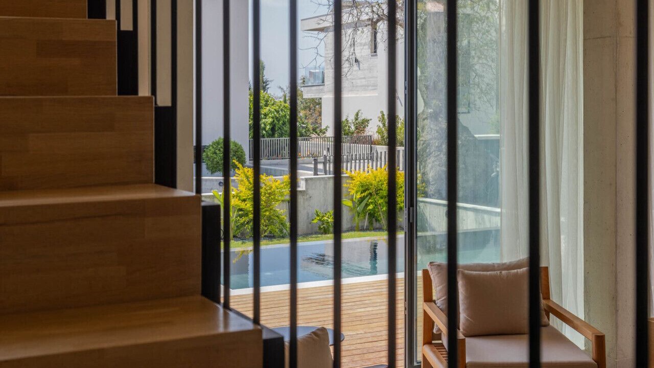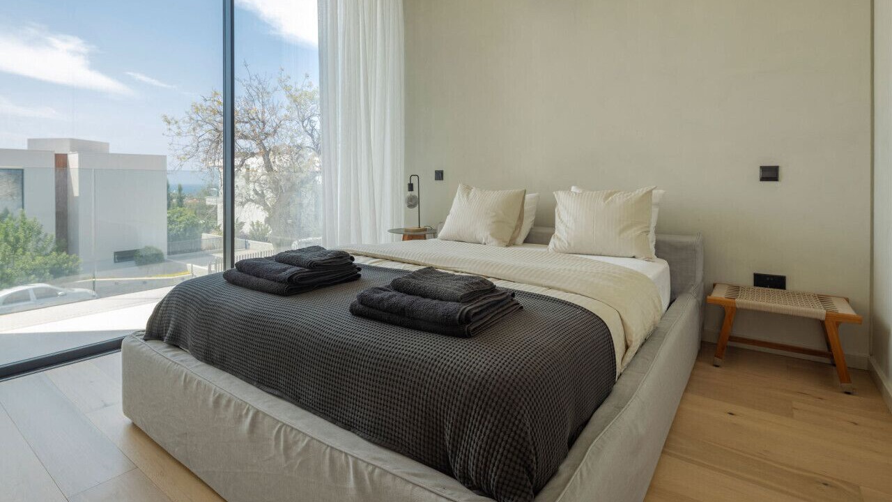 Furnished with modern elegance, the villa guarantees a comfortable and luxurious experience. Large windows in the bright rooms allow ample natural light and showcase magnificent views of the sea. Blinds and full-length curtains ensure privacy and darkness for a peaceful night’s sleep.