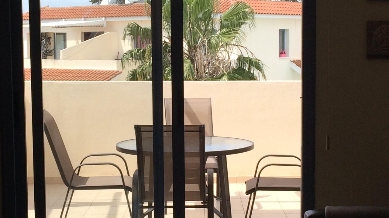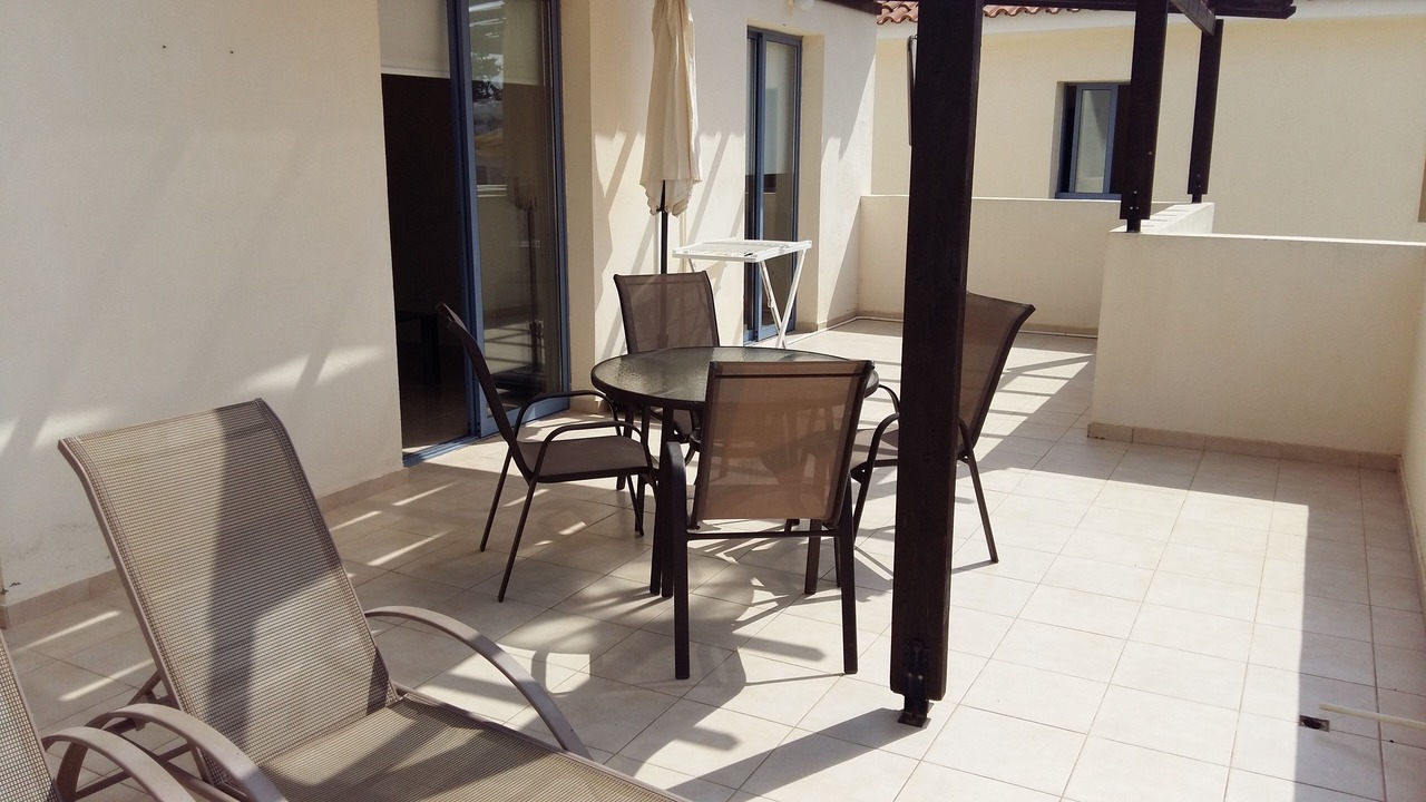 The living room and both bedroom patio doors open out onto a large balcony that runs the length of the property and has a table and chairs along with sunbeds. The balcony also over looks the communal pool