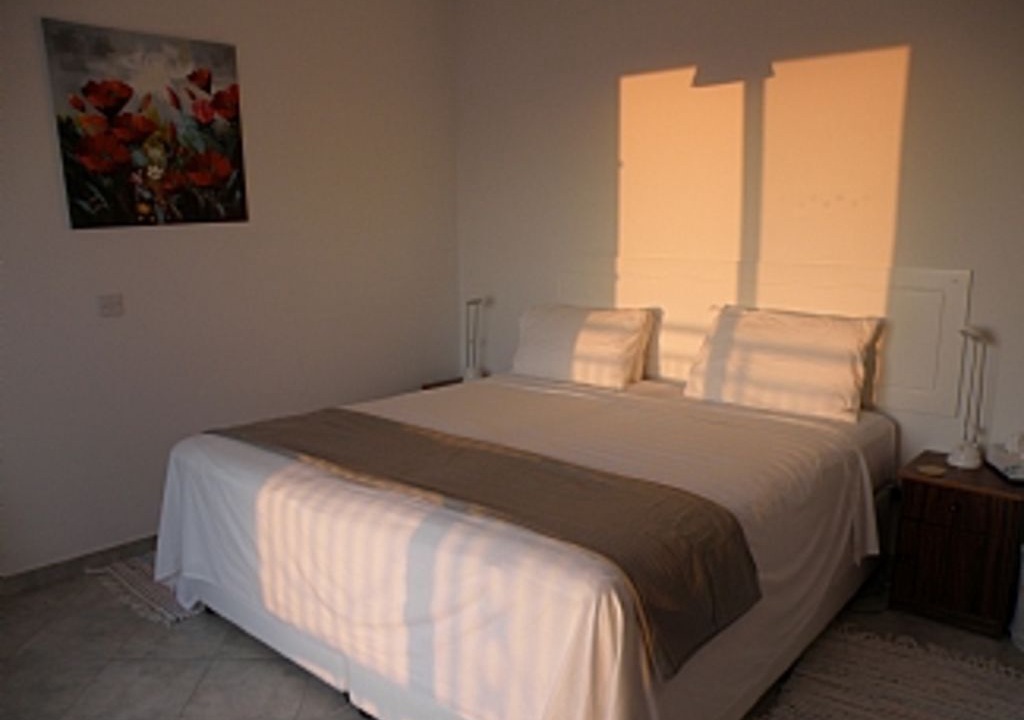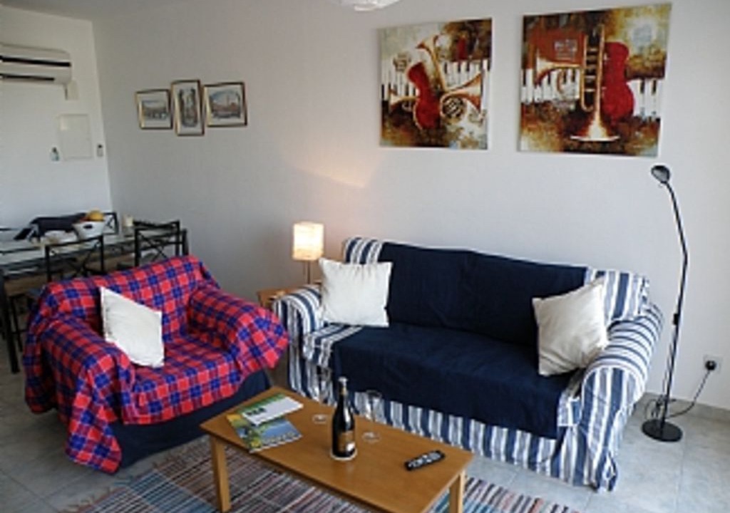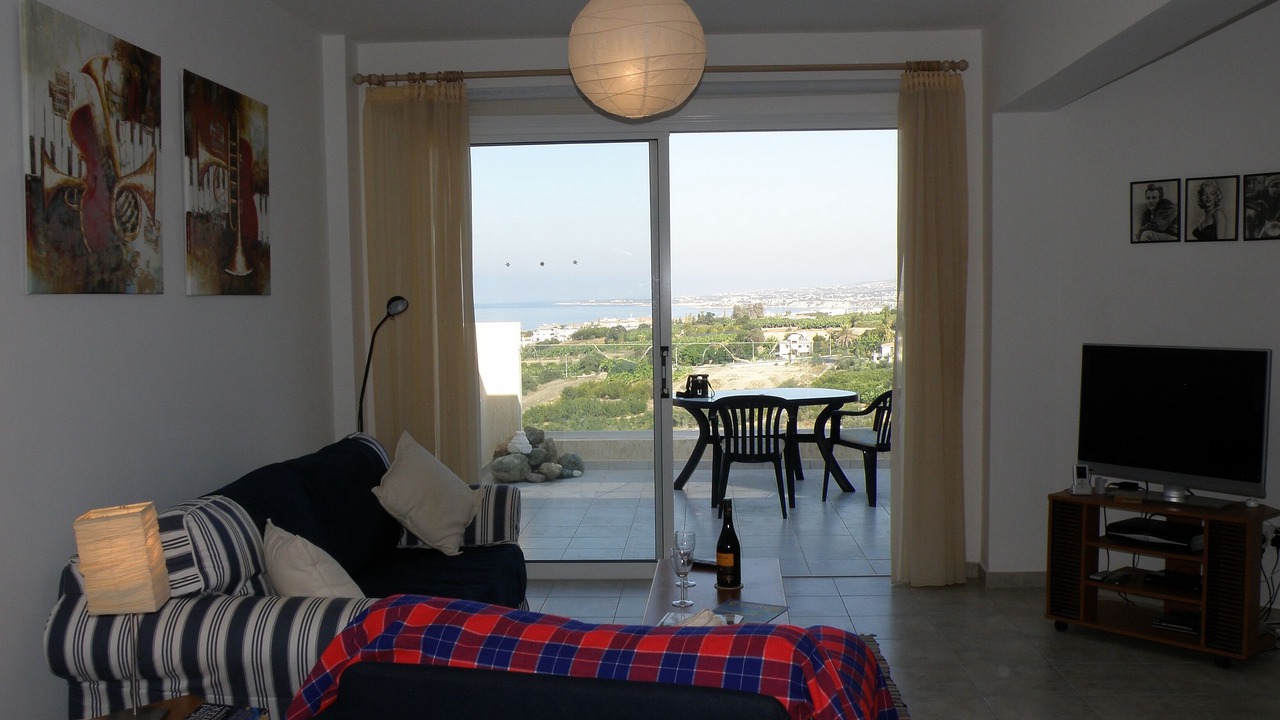 A well furnished. secure and spacious 1 bedroom apartment on the top floor of a modern development. The development has its own swimming pool on the lower level where parasols and sun beds are provided. The apartment has a wide terrace facing directly West - great for sundowners - with an uninterrupted panoramic views of the sea and hillsides to the north. Night time views are especially romantic. Both the living area and bedroom have sliding glass patio doors that open directly onto the terrace giving you a lovely view to wake up to. The apartment is situated on a hillside just below Kissonerga village, only 1km from Vardas Beach, and 5 mins drive to the famous Coral Bay beach. Wi-Fi connection is included.
