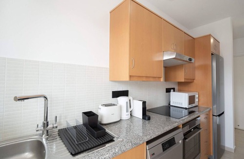 The apartment boasts a sleek, fully equipped kitchen, featuring a microwave, oven, stovetop, large refrigerator, and a Nespresso machine—everything you need for convenient meal preparation. A door from the kitchen opens to a shared veranda, providing additional outdoor space to enjoy.