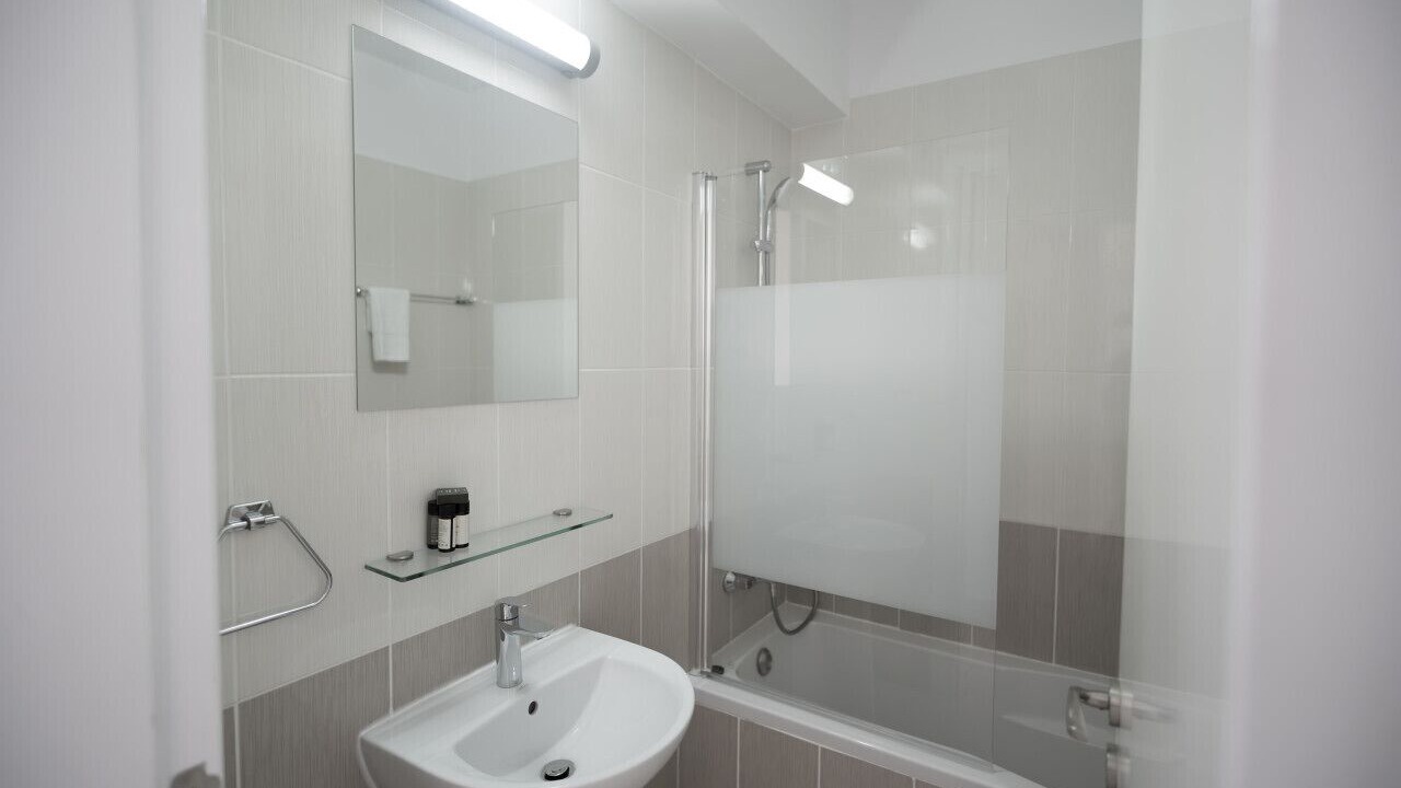 The apartment's second bathroom is modern and thoughtfully designed, featuring a bathtub for added convenience and comfort.