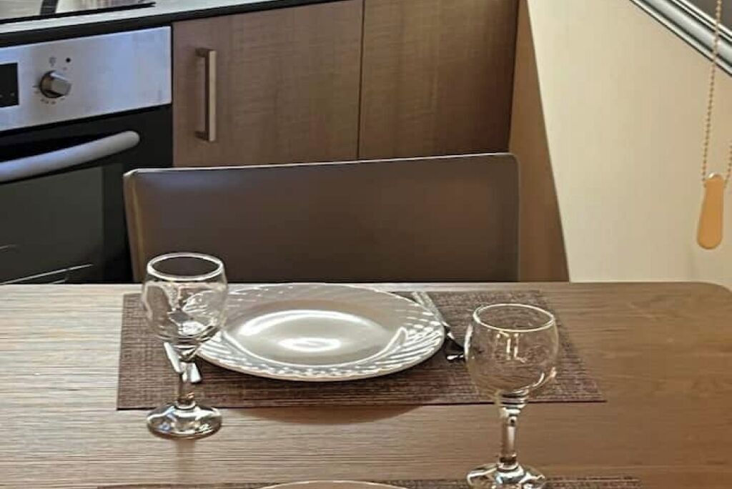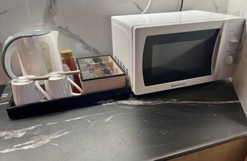 This studio has a kitchen area with an oven and hob, a large fridge and dining table. All equipment is provided as well as essential cooking ingredients and a complementary bottle of wine and snacks.