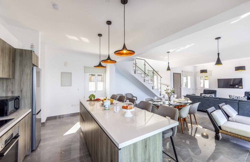 The interior is filled with natural light, creating a bright and airy atmosphere that perfectly complements the breathtaking views. The open-plan layout of the living room, kitchen, and dining area is enhanced by numerous patio doors that lead out to the pool terrace. With its Smart TV, breakfast bar, and stylish furnishings, this space is ideal for relaxation and enjoyment. Each bedroom offers its own access to a terrace or balcony, all of which face the sea. The master bedroom even features its own ensuite bathroom. Outside, the villa impresses with the soothing sound of the ocean as a backdrop, an infinity pool for refreshing dips, and a modern dining area for delightful barbecues.
