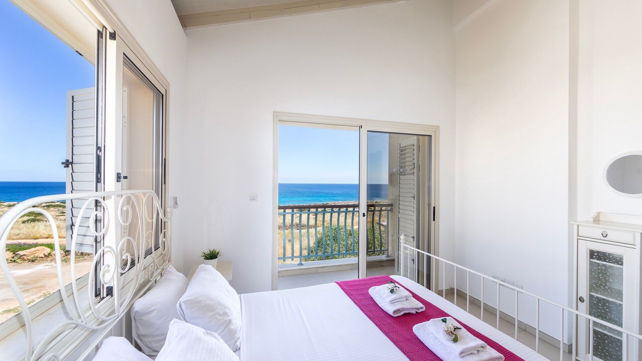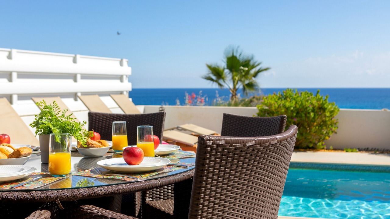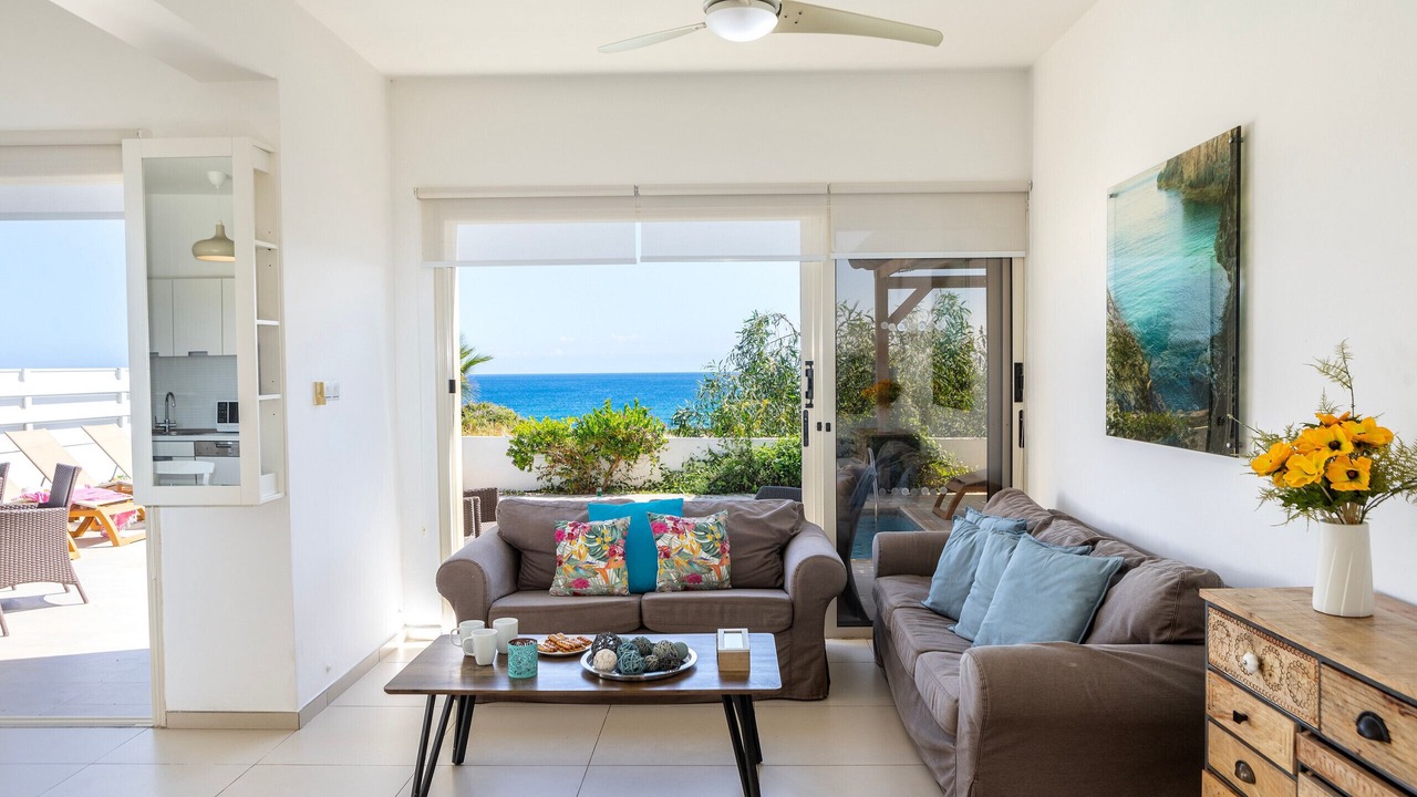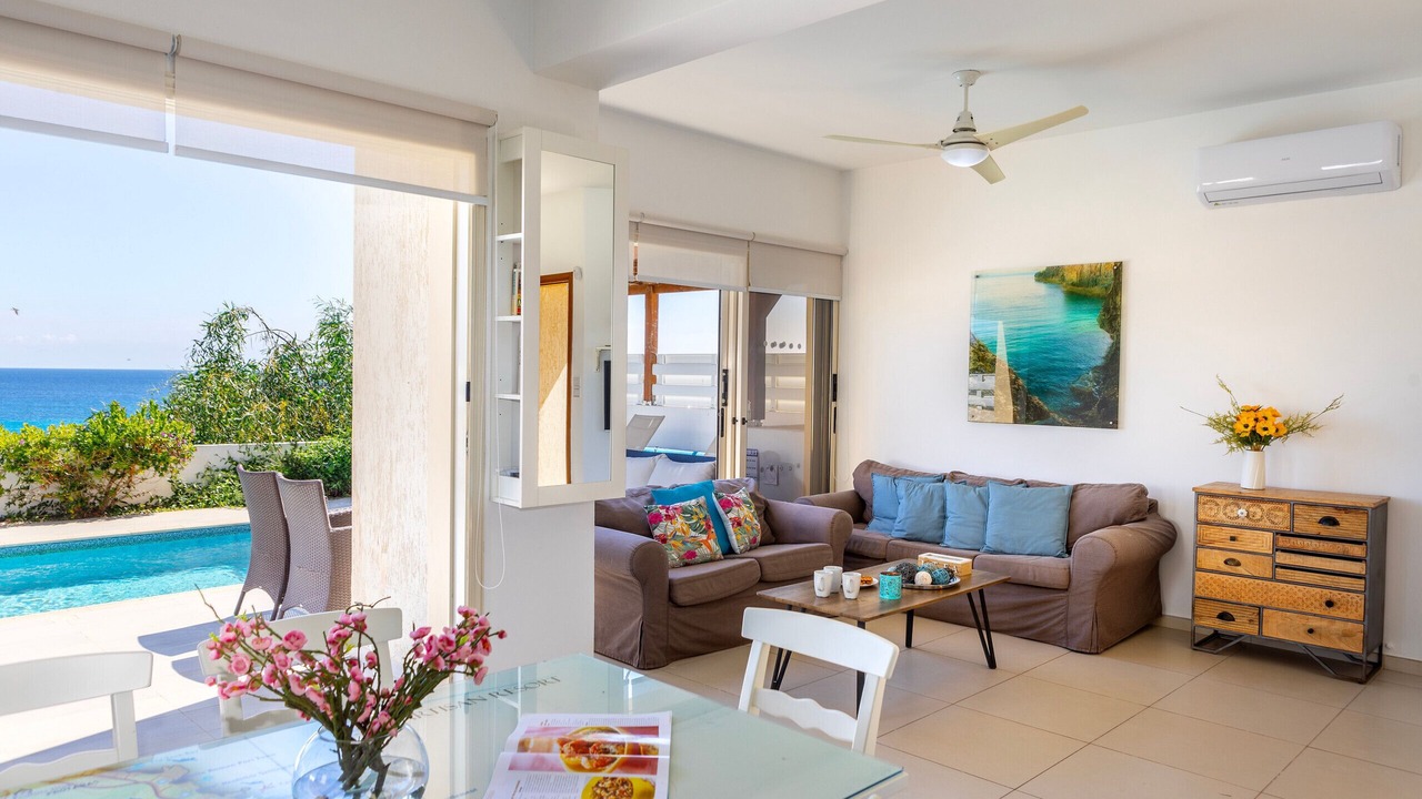Protaras Artisan Seafront Holiday Villa 1 is a seafront villa with unobstructed sea views ideally located in between the lively resort of Protaras and the scenic area of Capo Greko, just 100 meters from the sea and walking distance to Mimosa Beach and the Blue Flag Beach of Konnos Bay.