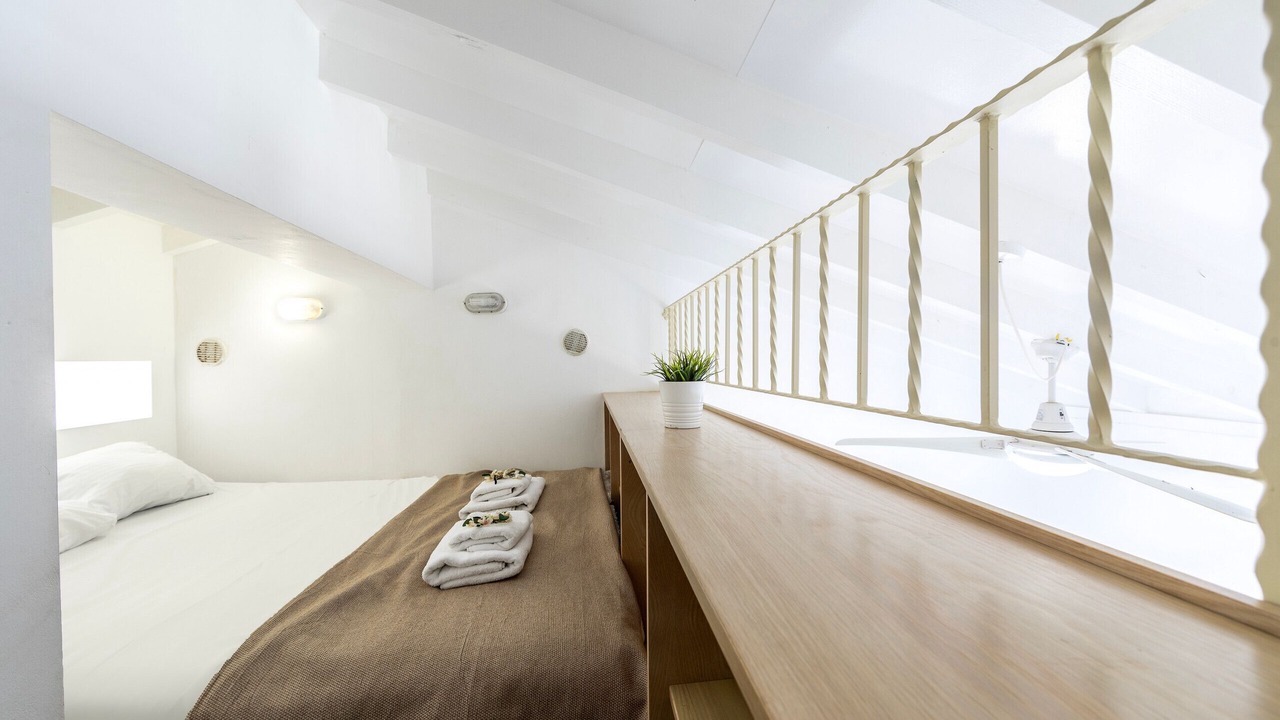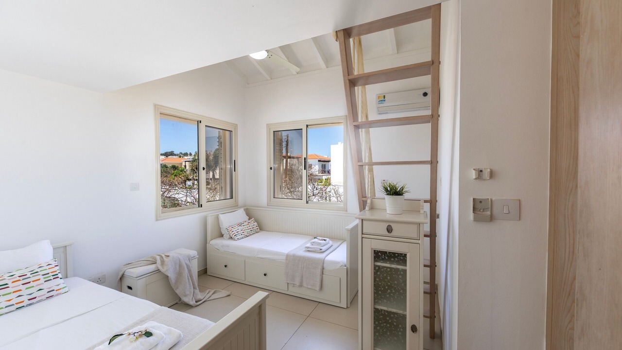 The ground floor features a small bedroom with a single bed, a shower room, an open plan kitchen, dining area and living room that opens up into the semi-covered pool patio area. The upper floor features a spacious master bedroom with a double bed, balcony and panoramic sea views, the third bedroom that also offers a large double bed and panoramic sea views. The the fourth bedroom that offers two single beds and a loft with a double bed, this room is ideal for children sharing a same room. On the same floor there is also the family bathroom.