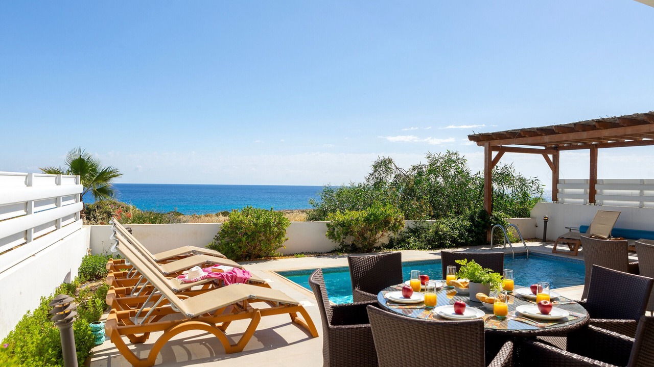 This modern and luxurious villa, furnished with utmost care to feel like a home away from home, offers panoramic seafront views, a private pool of approximate size 4x8m, a large pergola covered veranda with modern patio furniture, and BBQ.