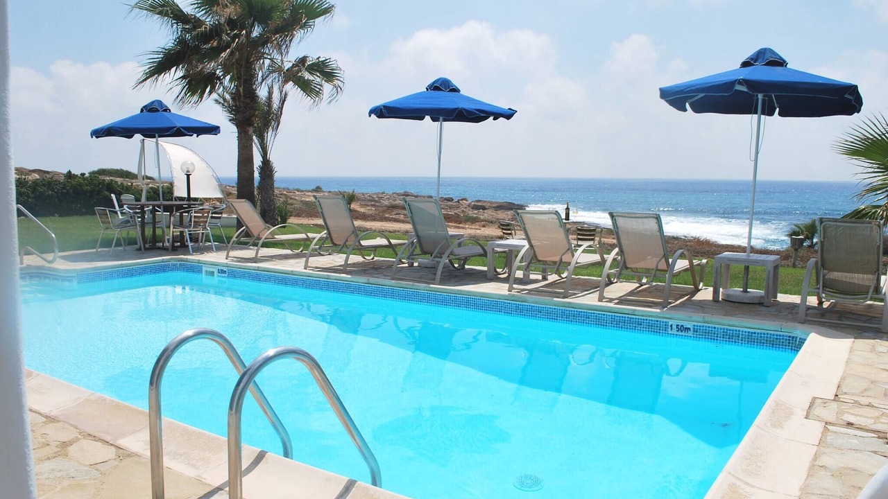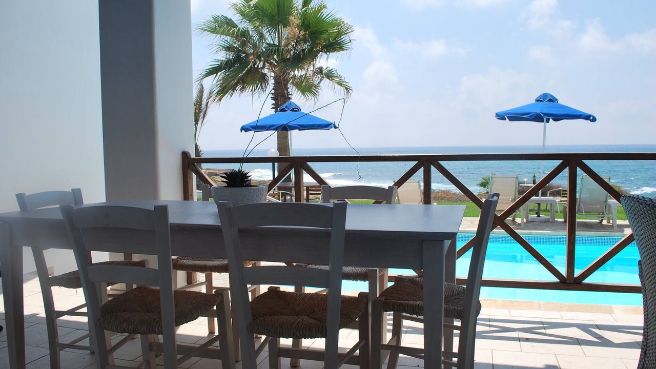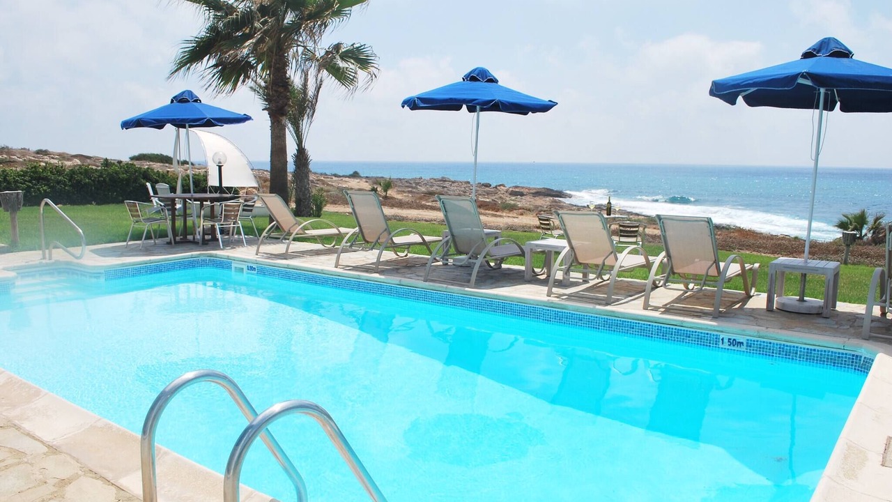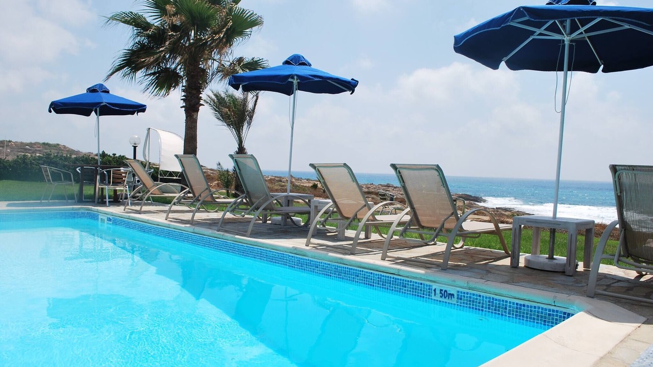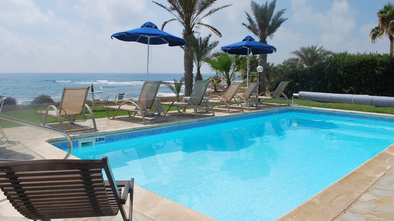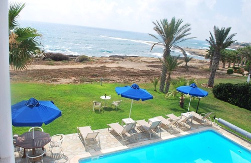 Relax with the whole family at this peaceful place to stay. This lovely villa situated exactly on the first sea-line on the Paphos coast, just 15 meters only from the Mediterranean shoreline. The villa has it's own private swimming-pool, patio and barbeque. The pool with walk-in steps is directly in front to the sea.