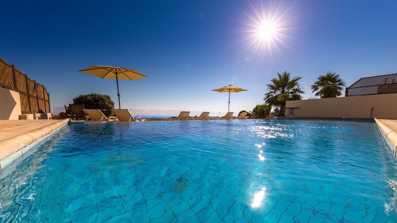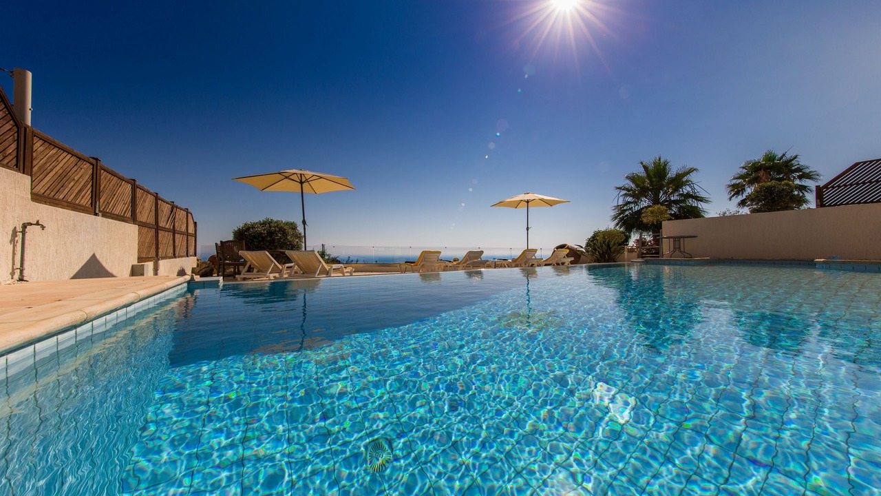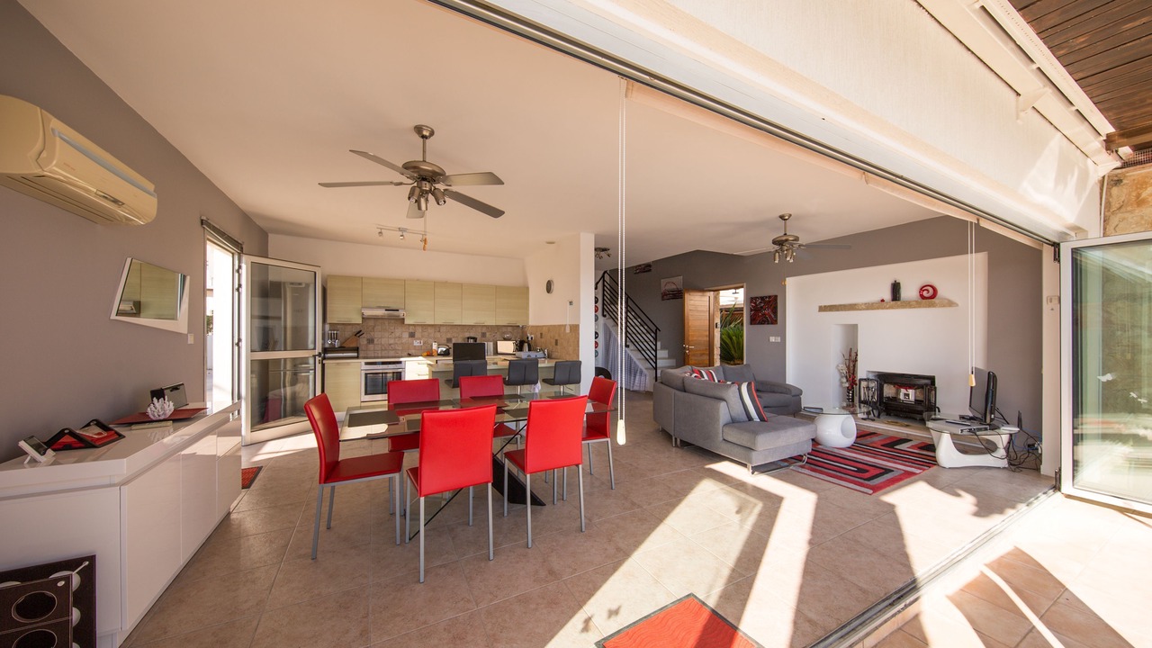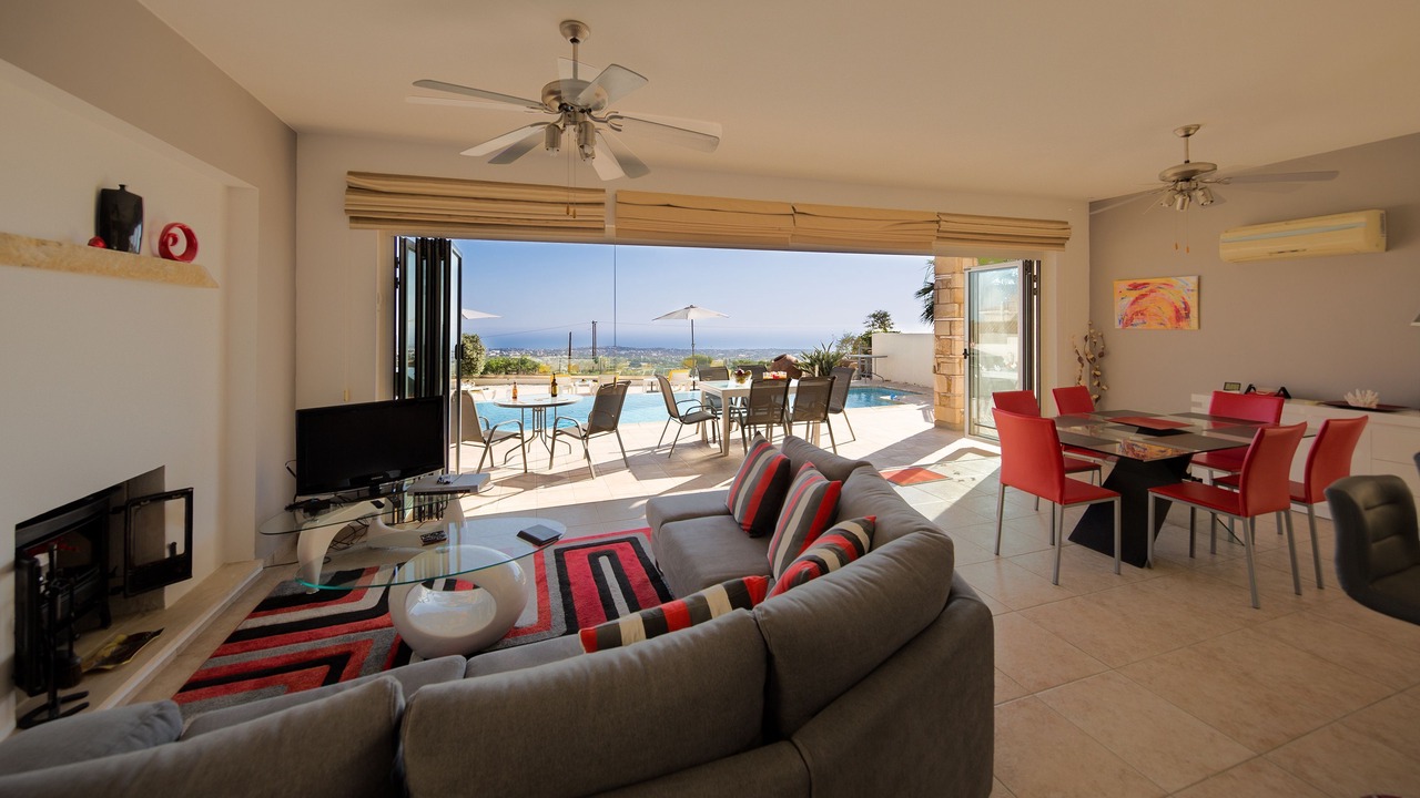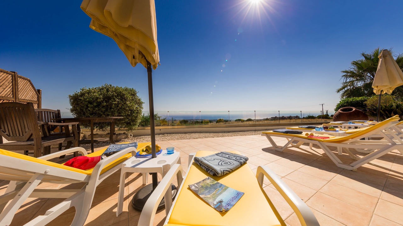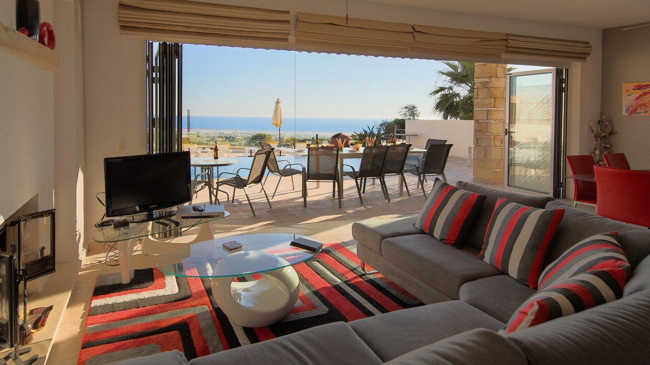 One of the villa's main features is the fully retractable glass patio doors which allow you to see the stunning view of the immediate patio/pool area following on to the undisturbed views of the immediate countryside and coastline.