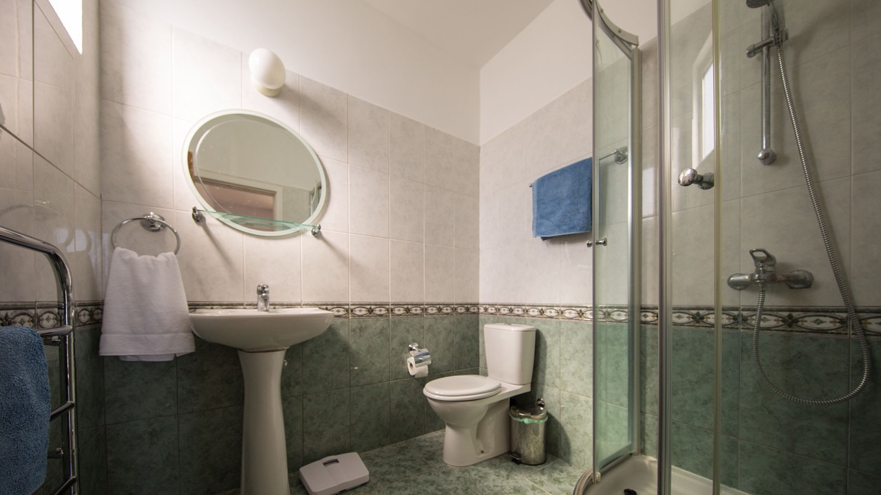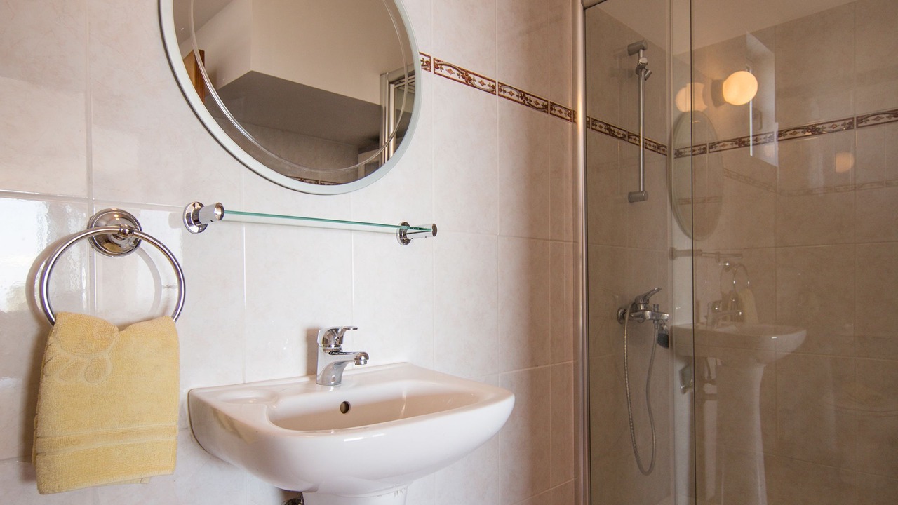 Upon leaving the bedroom immediately to the left is the downstairs bathroom. This large space has a double shower cubicle with WC & wash basin.