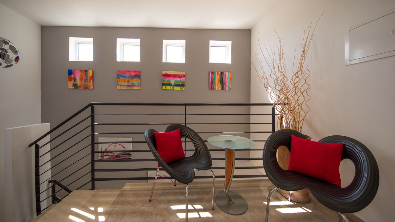 Once back out in the living area, you will notice the staircase with its striking artwork. Once on the first floor, the large bright airy landing space has again been created into a relaxation area to chill out with a book & a drink should you wish to.
