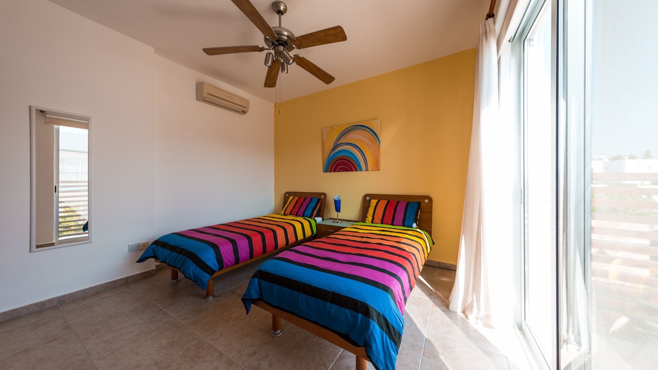 This floor accommodates the 3 further bedrooms within the villa. To the right of the stairs you will find another separate bathroom for use by the 2 twin rooms (can be doubles). There is a small balcony with a contrasting wooden surround which will allow you to enjoy the morning sunshine with views of the mountains or the cool shade of the day in some peace & quiet. Next to this is the first of the twin bedrooms offering colour and bright space with again full length wardrobes for your belongings.