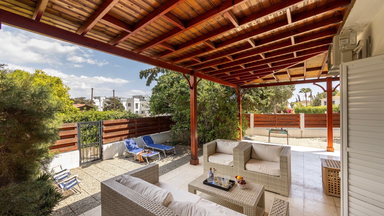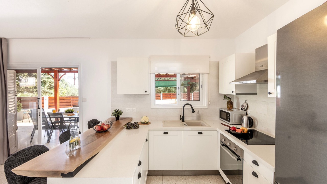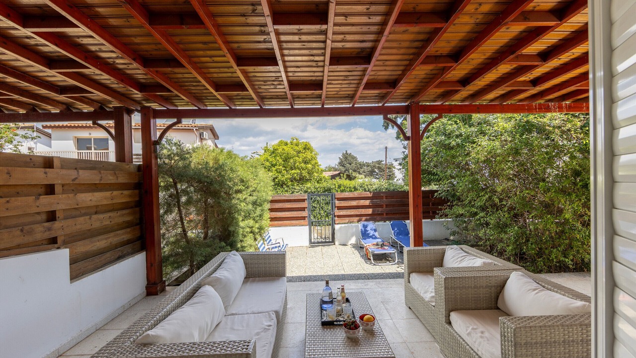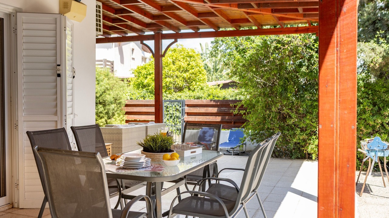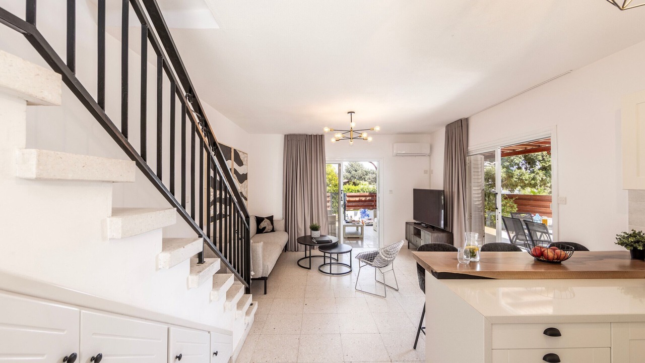 Villa Marina is a two bedroom semi-detached house located in a small development on Kiti Beach. The house has been fully renovated in 2025 and offers all modern appliances and equipment. The ground floor features a modern kitchen, an open plan living room and dinning area that leads to an outside patio equipped with table, chairs and an outdoor settee. The master bedroom on the first floor offers a large double bed, the second bedroom offers comfortable twin beds. Spacious and clean family bathroom with the shower is located between the bedrooms to share.