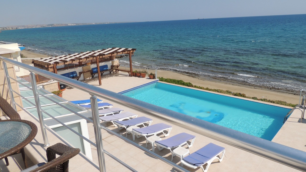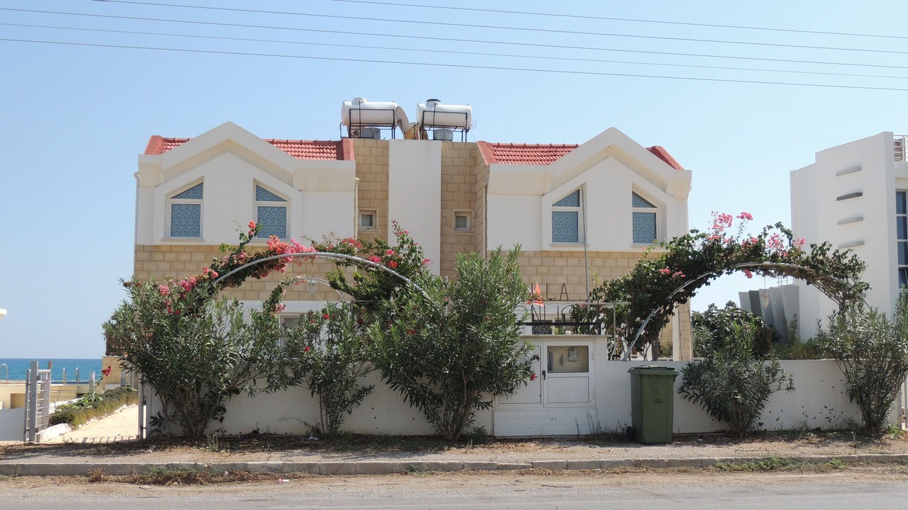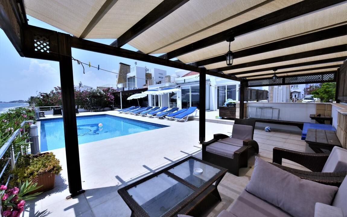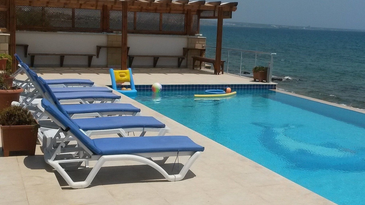 Villa Moonlight has a unique feature of being a new Villa on the beach and has a total of 7 bedrooms. The villa has a lovely front garden with colourful, scented flowers and jasmine trees. At the rear of the villa, there is large family terrace with an infinity pool, overlooking the beach/sea. There is a Pergola with dining tables and chairs, together with an authentic stone barbecue. There are bench seating areas, plenty of sun beds (with individual sun umbrellas), a swing chair, outdoor coffee table and chairs and an outdoor sofa group. Our home can be tailored and adapted towards each booking giving the flexibility to add as many rooms according to our guest's needs. It is perfectly located and only 8 minutes away (walking distance) from the bars, restaurants and supermarkets. Villa Moonlight is furnished to a luxury and high standard complete with all mod cons and versatile that can be adapted to suit different group sizes and guest's needs on request. (Please note that the house has 5 bedrooms but there are two extra bedrooms, lounge and kitchen for larger group sizes). Please check with the owner if you need the extra space for your group size. Maximum sleeping capacity 14 guests. 2 separate families can stay together, for example. But couples are welcome too, as the villa has an amazing romantic setting! The Villa is on the main road to Karpaz peninsula. The back of villa sits on it's own beach which is very peaceful and calming. So, the villa is perfect for relaxation. The famous karate tortoises leave their eggs in the sand, on the beach, at the back of the villa, in the month of May. The villa also has a caretaker in a separate flat, he can help with any queries and if there are any problems, can fix quickly.
