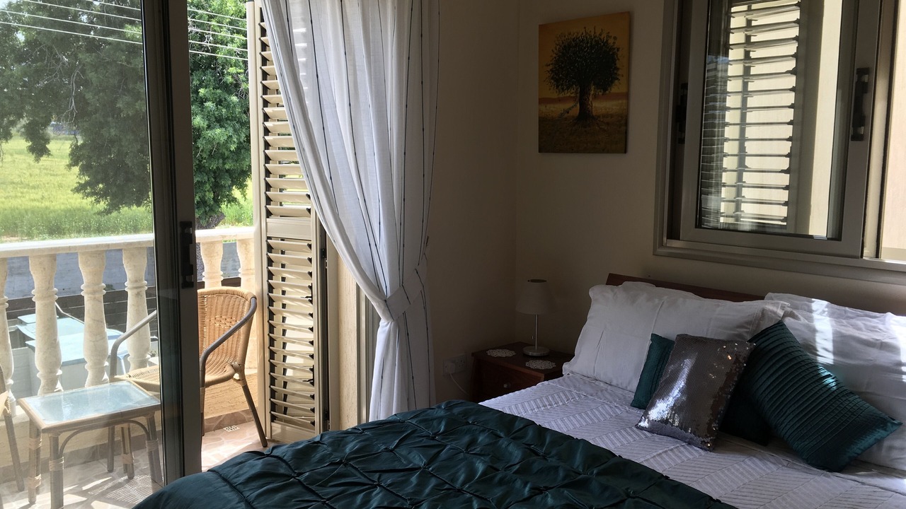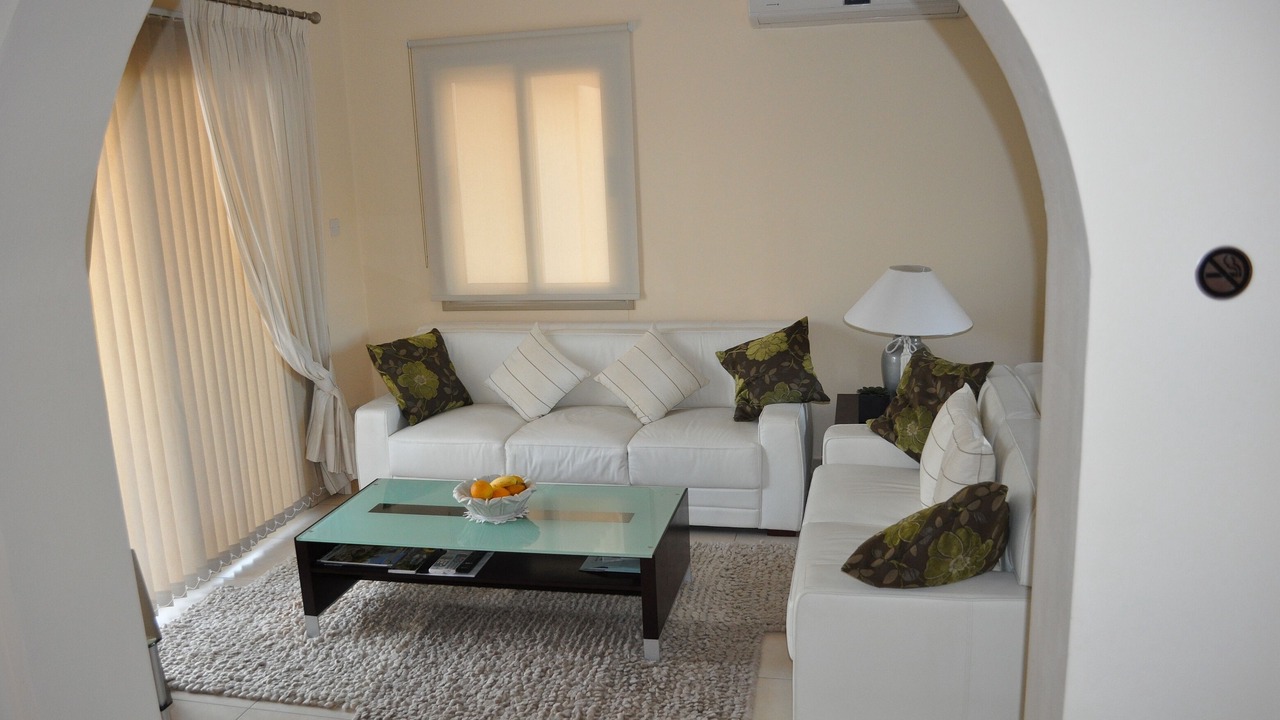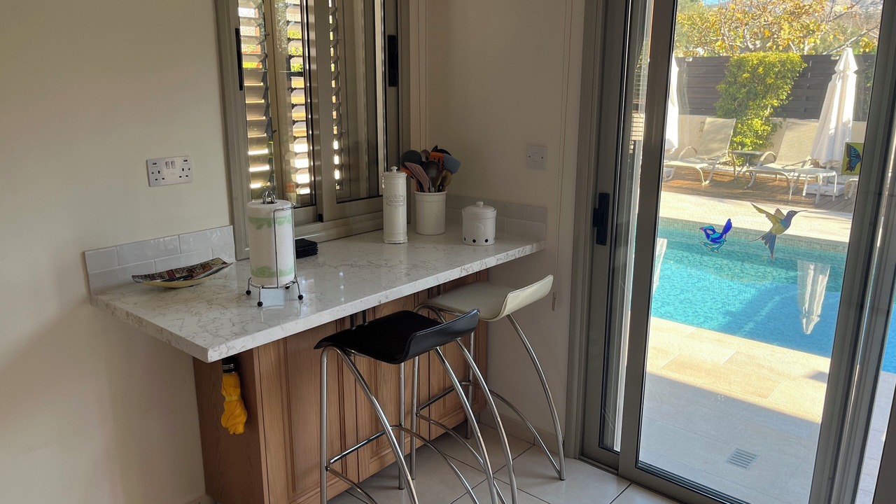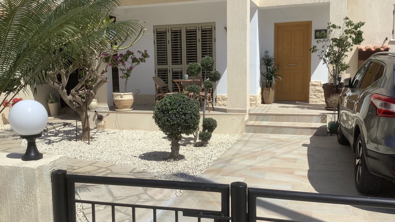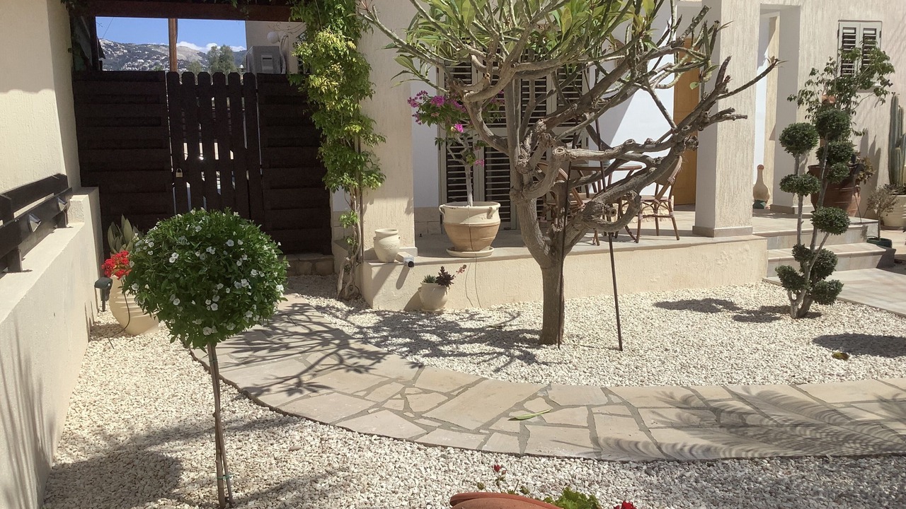 Villa Tala View lies in a beautiful setting in the small sleepy village of Kissonerga, amid lemon groves and banana plantations. Our three bedroom link detached villa, is set in landscaped gardens with a large 8 x 4m private swimming pool with Roman Steps, giving the feel of paradise. Beyond are the fantastic views of the Hills of Tala. This superb holiday accommodation contains every convenience for a comfortable and memorable holiday. Air-con, ceiling fans and fly-screens are provided. Shutters all around have been installed recently (January 2013) all designed to keep you nice and cool when inside. A complimentary welcome pack will greet you on arrival. Every window (June 2013) has a fly screen including bathrooms and en-suite, now the refreshing breezes can circulate inside and the horrible little whatsits will have to stay outside.