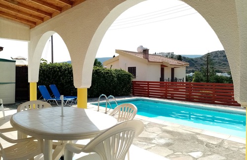 Villa A9 enjoys a quiet setting in a small mature development called Klimataria, within easy walking distance of the blue flag Pissouri Beach and with its own private pool. Being half way between Paphos and Limassol, Pissouri Bay is away from the main resorts and ideally situated for exploring the coast, the villages and mountains of Cyprus. The area will suit those who welcome a chance to relax, unwind and possibly enjoy a wide variety of activities including golf (Secret Valley and Aphrodite Hills courses) and water sports such as sailing, windsurfing and diving. The villa is comfortably furnished and comprehensively equipped. Behind hibiscus hedges, the paved garden is private and secluded. Towards the beach there are a wide variety of restaurants and tavernas. Our competitive price includes air-conditioning in the bedrooms.The old village of Pissouri is about 3km from the villa and is very picturesque, retaining it's unspoilt charm.